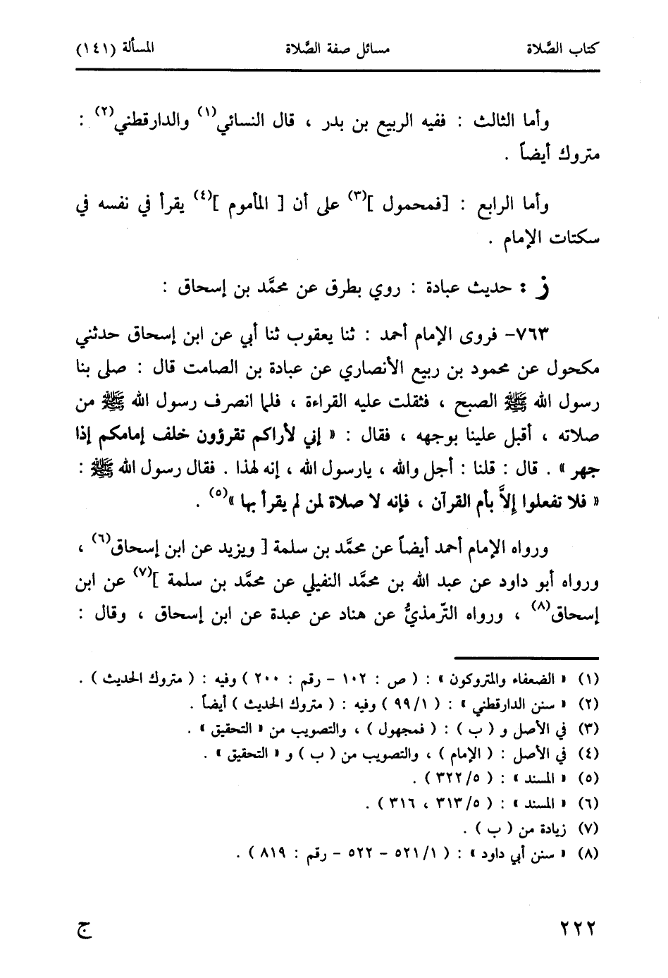 763 - فروى الإمام أحمد: ثنا يعقوب ثنا أبي عن ابن إسحاق حدَّثني مكحول عن محمود بن ربيع الأنصاري عن عبادة بن الصامت قال: صلَّى بنا رسول الله صَلَّى اللَّهُ عَلَيْهِ وَسَلَّمَ الصُّبح، فثقلت عليه القراءة، فلما انصرف رسول الله صَلَّى اللَّهُ عَلَيْهِ وَسَلَّمَ من صلاته، أقبل علينا بوجهه، فقال: " إني لأراكم تقرؤون خلف إمامكم إذا جهر ". قال: قلنا: أجل والله، يارسول الله، إنه لهذا. فقال رسول الله صَلَّى اللَّهُ عَلَيْهِ وَسَلَّمَ: " فلا تفعلوا إلا بأم القرآن، فإنه لا صلاة لمن لم يقرأ بها " (5).