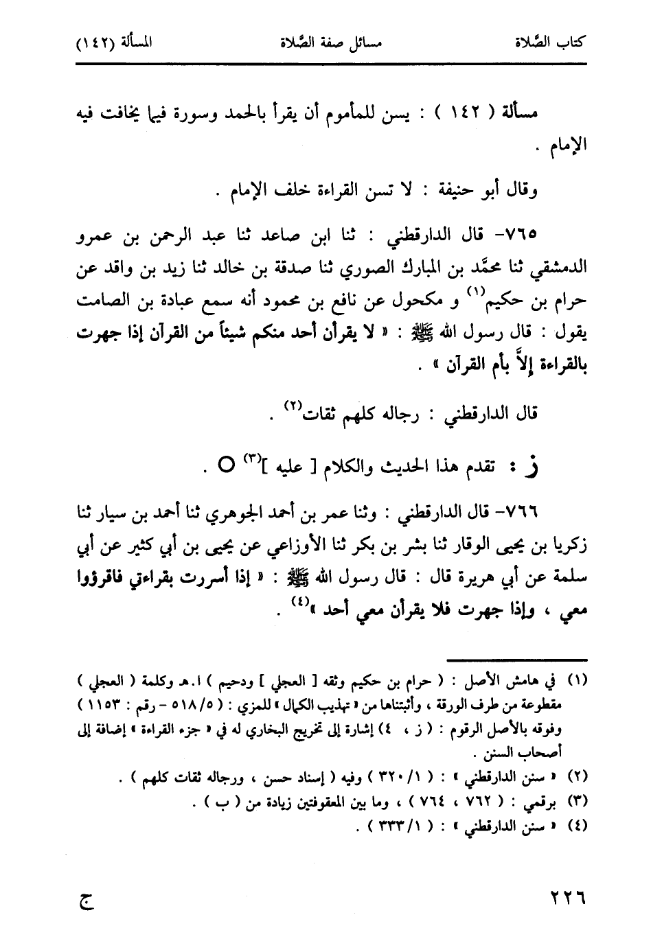765 - قال الدَّارَقُطْنِيُّ: ثنا ابن صاعد ثنا عبد الرَّحمن بن عمرو الدمشقي ثنا محمد بن المبارك الصوري ثنا صدقة بن خالد ثنا زيد بن واقد عن حرام بن حكيم (1) ومكحول عن نافع بن محمود أنه سمع عبادة بن الصامت يقول: قال رسول الله صَلَّى اللَّهُ عَلَيْهِ وَسَلَّمَ: " لا يقرأن أحد منكم شيئاً من القرآن إذا جهرت بالقراءة إلا بأم القرآن ".