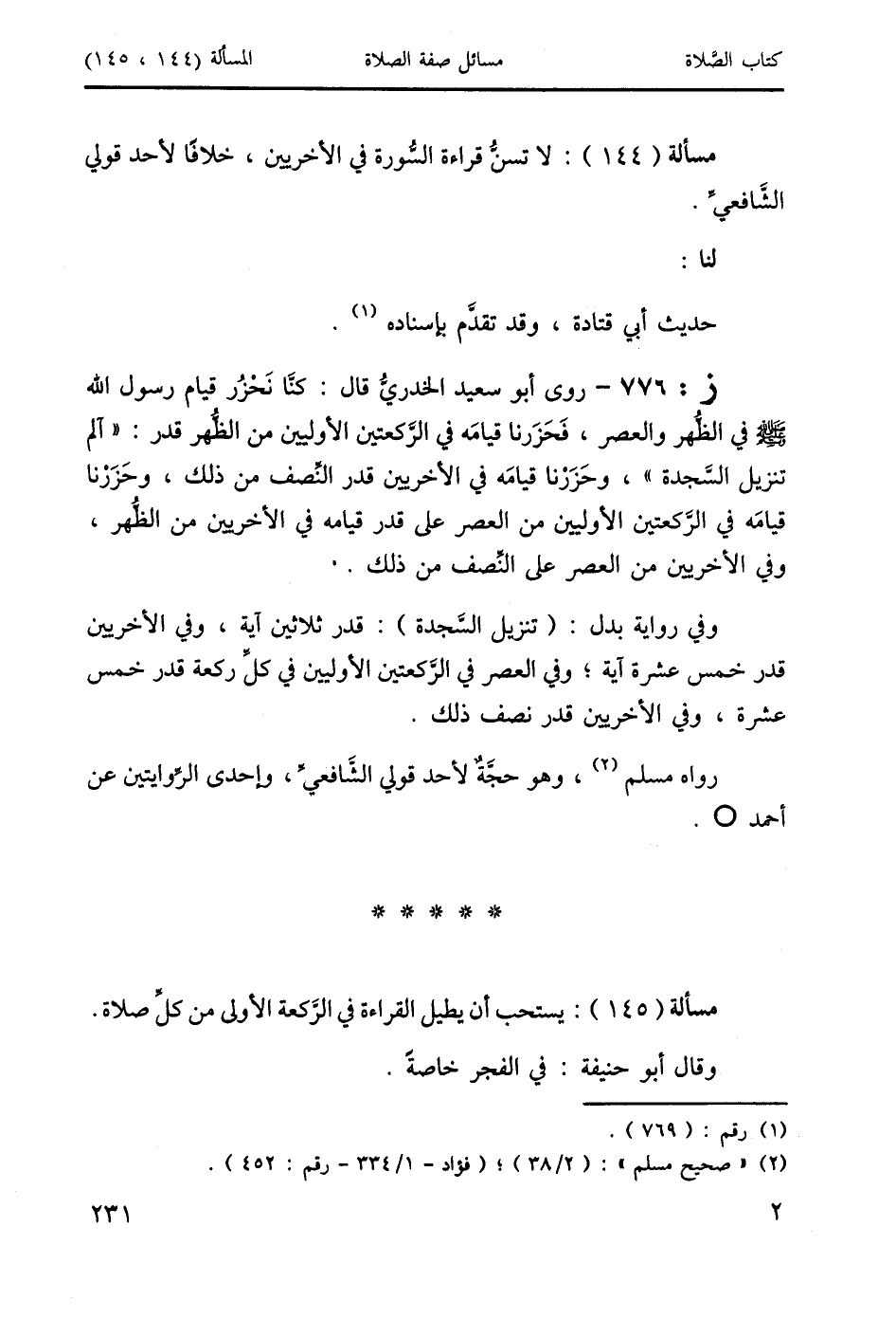ز: 776 - روى أبو سعيد الخدريُّ قال: كنَّا نَحْزُر قيام رسول الله صَلَّى اللَّهُ عَلَيْهِ وَسَلَّمَ في الظُّهر والعصر، فَحَزَرنا قيامَه في الرَّكعتين الأوليين من الظُّهر قدر: " آلم تنزيل السَّجدة "، وحَزَرْنا قيامَه في الأخريين قدر النِّصف من ذلك، وحَزَرْنا قيامَه في الرَّكعتين الأوليين من العصر على قدر قيامه في الأخريين من الظُّهر، وفي الأخريين من العصر على النِّصف من ذلك.