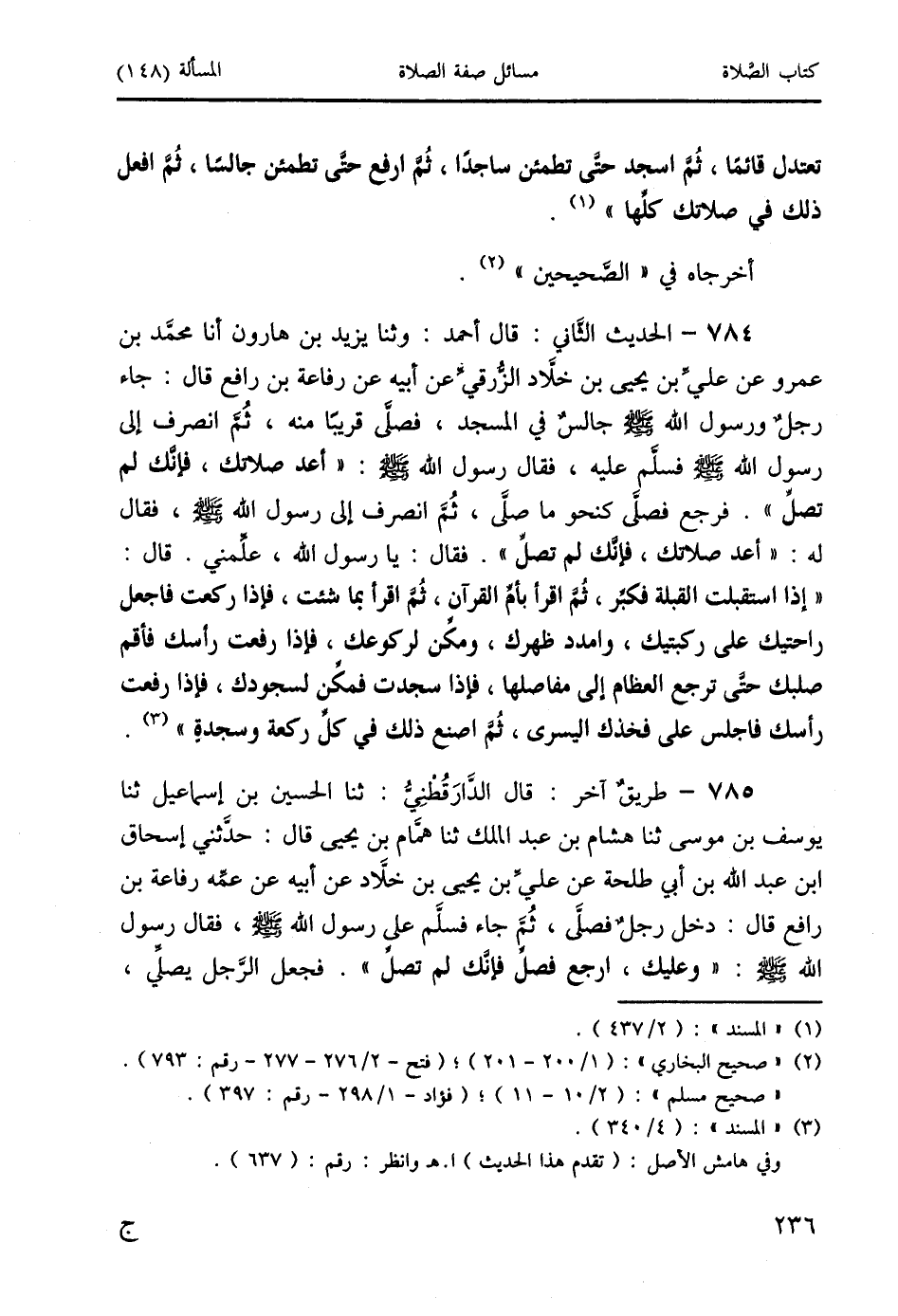 785 - طريقٌ آخر: قال الدَّارَقُطْنِيُّ: ثنا الحسين بن إسماعيل ثنا يوسف بن موسى ثنا هشام بن عبد الملك ثنا همَّام بن يحيى قال: حدَّثني إسحاق ابن عبد الله بن أبي طلحة عن عليِّ بن يحيى بن خلاَّد عن أبيه عن عمِّه رفاعة بن رافع قال: دخل رجلٌ فصلَّى، ثُمَّ جاء فسلَّم على رسول الله صَلَّى اللَّهُ عَلَيْهِ وَسَلَّمَ، فقال رسول الله صَلَّى اللَّهُ عَلَيْهِ وَسَلَّمَ: " وعليك، ارجع فصلِّ فإنَّك لم تصلِّ ". فجعل الرَّجل يصلِّي،
