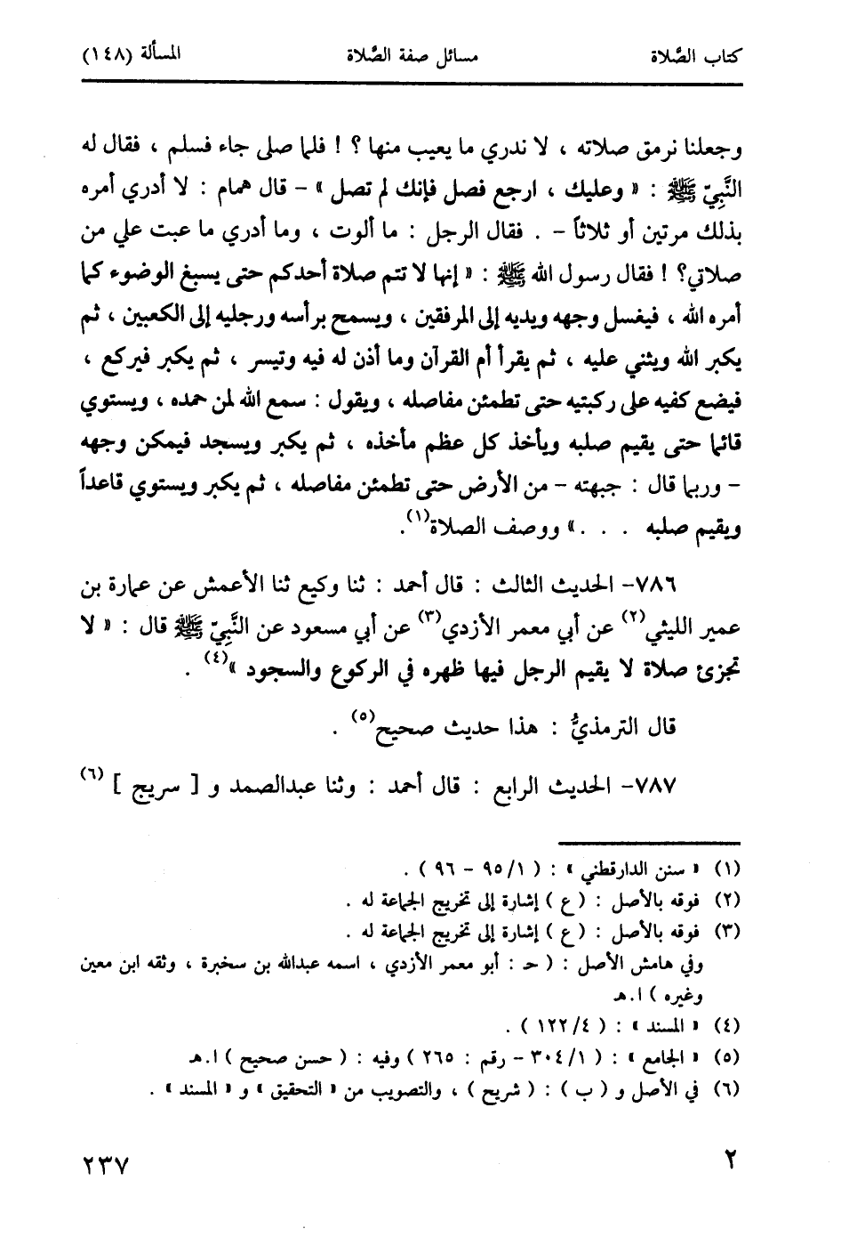 وجعلنا نرمق صلاته، لا ندري ما يعيب منها؟! فلما صلَّى جاء فسلم، فقال له النَّبِيُّ صَلَّى اللَّهُ عَلَيْهِ وَسَلَّمَ: "وعليك، ارجع فصلِّ فإنك لم تصلِّ" - قال همام: لا أدري أمره بذلك مرتين أو ثلاثاً -. فقال الرجل: ما ألوت، وما أدري ما عبت علي من صلاتي؟! فقال رسول الله صَلَّى اللَّهُ عَلَيْهِ وَسَلَّمَ: " إنها لا تتم صلاة أحدكم حتى يسبغ الوضوء كما أمره الله، فيغسل وجهه ويديه إلى المرفقين، ويمسح برأسه ورجليه إلى الكعبين، ثم يكبر الله ويثني عليه، ثم يقرأ أم القرآن وما أذن له فيه وتيسر، ثم يكبر فيركع، فيضع كفيه على ركبتيه حتى تطمئن مفاصله، ويقول: سمع الله لمن حمده، ويستوي قائمًا حتى يقيم صلبه ويأخذ كل عظم مأخذه، ثم يكبر ويسجد فيمكن وجهه - وربما قال: جبهته - من الأرض حتى تطمئن مفاصله، ثم يكبر ويستوي قاعداً ويقيم صلبه ... " ووصف الصَّلاة (1).