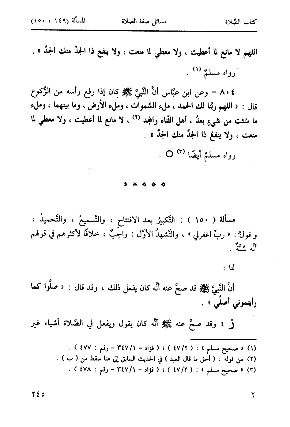 مسألة (150): التَّكبيرُ بعد الافتتاحِ، والتَّسميعُ، والتَّحميدُ، وقولُ: " ربِّ اغفر لي "، والتَّشهدُ الأوَّل: واجبٌ، خلافًا لأكثرهم في قولهم أنَّه سُنَّة.