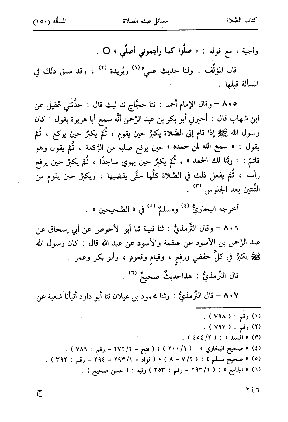 806 - وقال التِّرمذيُّ: ثنا قتيبة ثنا أبو الأحوص عن أبي إسحاق عن عبد الرَّحمن بن الأسود عن علقمة والأسود عن عبد الله قال: كان رسول الله صَلَّى اللَّهُ عَلَيْهِ وَسَلَّمَ يكبِّر في كلِّ خفضٍ ورفعٍ، وقيامٍ وقعودٍ، وأبو بكر وعمر.