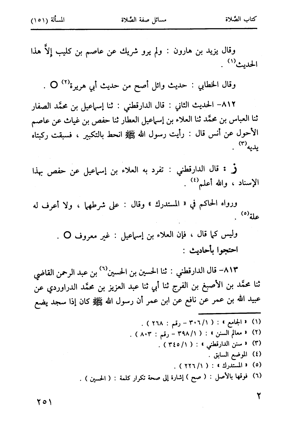 812 - الحديث الثَّاني: قال الدَّارَقُطْنِيُّ: ثنا إسماعيل بن محمد الصفار ثنا العباس بن محمد ثنا العلاء بن إسماعيل العطار ثنا حفص بن غياث عن عاصم الأحول عن أنس قال: رأيت رسول الله صَلَّى اللَّهُ عَلَيْهِ وَسَلَّمَ انحط بالتكبير، فسبقت ركبتاه يديه (3).