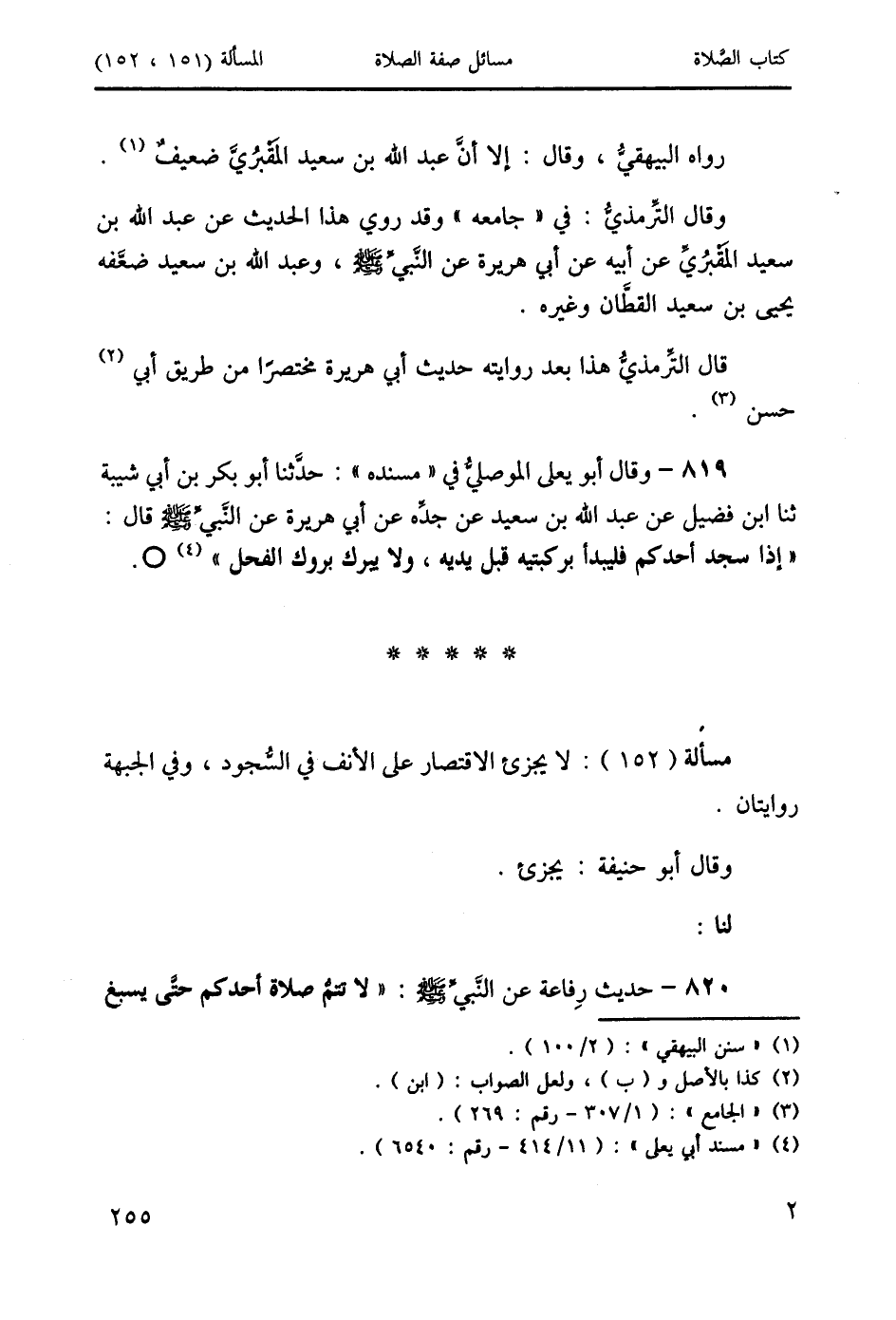 819 - وقال أبو يعلى الموصليُّ في "مسنده": حدَّثنا أبو بكر بن أبي شيبة ثنا ابن فضيل عن عبد الله بن سعيد عن جدِّه عن أبي هريرة عن النَّبيِّ صَلَّى اللَّهُ عَلَيْهِ وَسَلَّمَ قال: " إذا سجد أحدكم فليبدأ بركبتيه قبل يديه، ولا يبرك بروك الفحل " (4) O.