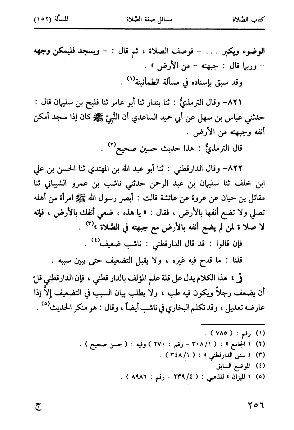 822 - وقال الدَّارَقُطْنِيُّ: ثنا أبو عبد الله بن المهتدي ثنا الحسن بن علي ابن خلف ثنا سليمان بن عبد الرَّحمن حدَّثني ناشب بن عمرو الشيباني ثنا مقاتل بن حيان عن عروة عن عائشة قالت: أبصر رسول الله صَلَّى اللَّهُ عَلَيْهِ وَسَلَّمَ امرأة من أهله تصلِّي ولا تضع أنفها بالأرض، فقال: "يا هذه، ضعي أنفك بالأرض، فإنه لا صلاة لمن لم يضع أنفه بالأرض مع جبهته في الصَّلاة" (3).