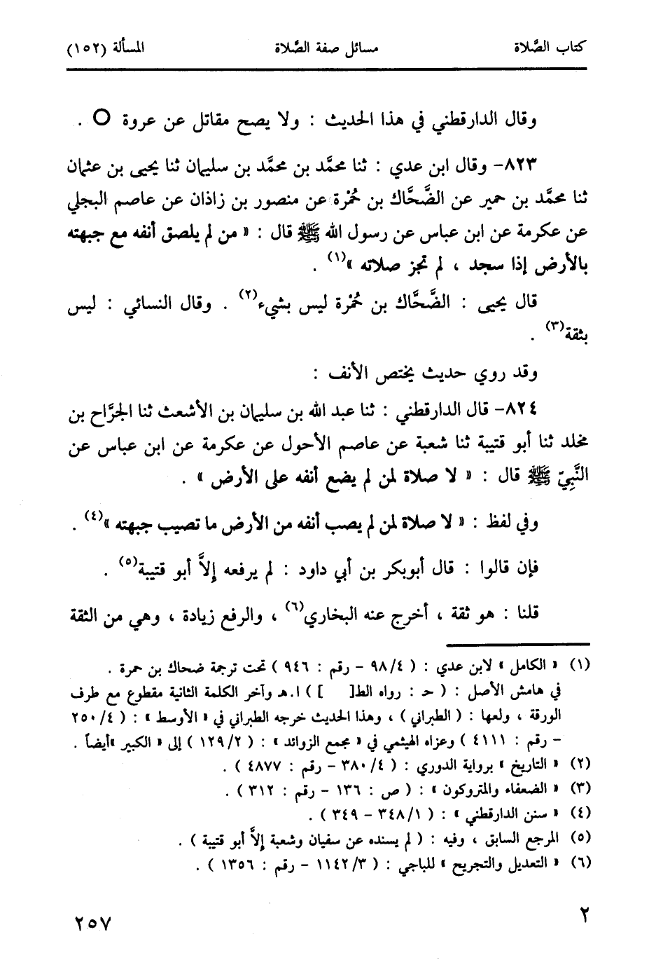 824 - قال الدَّارَقُطْنِيُّ: ثنا عبد الله بن سليمان بن الأشعث ثنا الجرَّاح بن مخلد ثنا أبو قتيبة ثنا شعبة عن عاصم الأحول عن عكرمة عن ابن عباس عن النَّبِيِّ صَلَّى اللَّهُ عَلَيْهِ وَسَلَّمَ قال: " لا صلاة لمن لم يضع أنفه على الأرض ".