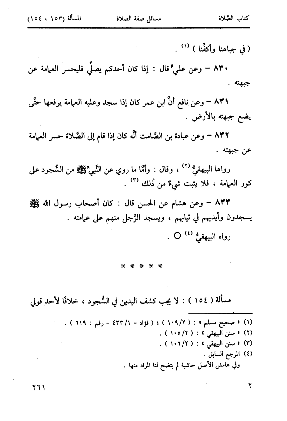 833 - وعن هشام عن الحسن قال: كان أصحاب رسول الله صَلَّى اللَّهُ عَلَيْهِ وَسَلَّمَ يسجدون وأيديهم في ثيابهم، ويسجد الرَّجل منهم على عمامته.
