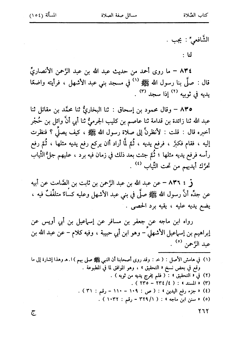 834 - ما روى أحمد من حديث عبد الله بن عبد الرَّحمن الأنصاريِّ قال: صلَّى بنا رسول الله صَلَّى اللَّهُ عَلَيْهِ وَسَلَّمَ (1) في مسجد بني عبد الأشهل، فرأيته واضعًا يديه في ثوبيه (2) إذا سجد (3).