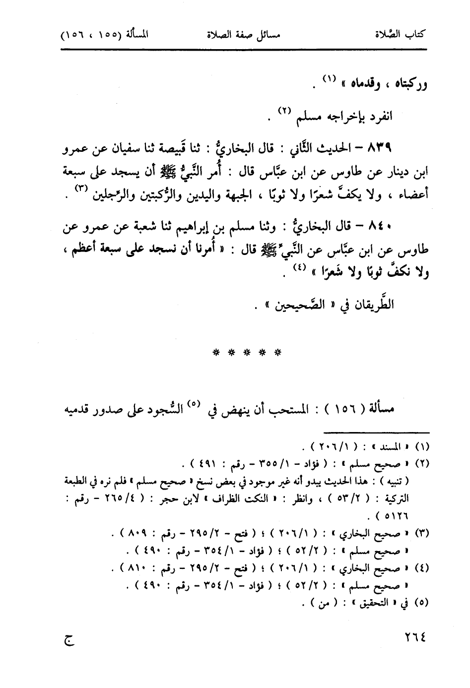 839 - الحديث الثَّاني: قال البخاريُّ: ثنا قَبيصة ثنا سفيان عن عمرو ابن دينار عن طاوس عن ابن عباس قال: أُمر النَّبيُّ صَلَّى اللَّهُ عَلَيْهِ وَسَلَّمَ أن يسجد على سبعة أعضاء، ولا يكفَّ شعرًا ولا ثوبًا، الجبهة واليدين والرُّكبتين والرِّجلين (3).