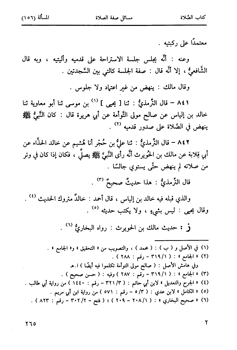 841 - قال التِّرمذيُّ: ثنا [يحيى] (1) بن موسى ثنا أبو معاوية ثنا خالد بن إلياس عن صالح مولى التَّوأمة عن أبي هريرة قال: كان النَّبيُّ صَلَّى اللَّهُ عَلَيْهِ وَسَلَّمَ ينهض في الصَّلاة على صدور قدميه (2).