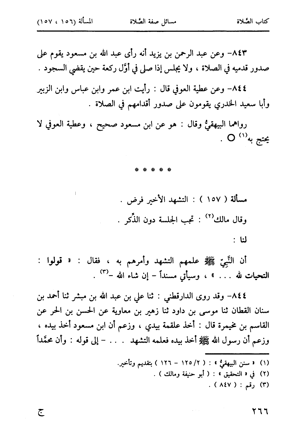 844 - وقد روى الدَّارَقُطْنِيُّ: ثنا علي بن عبد الله بن مبشر ثنا أحمد بن سنان القطان ثنا موسى بن داود ثنا زهير بن معاوية عن الحسن بن الحر عن القاسم بن مخيمرة قال: أخذ علقمة بيدي، وزعم أن ابن مسعود أخذ بيده، وزعم أن رسول الله صَلَّى اللَّهُ عَلَيْهِ وَسَلَّمَ أخذ بيده فعلمه التشهد ... - إلى قوله: وأن محمداً