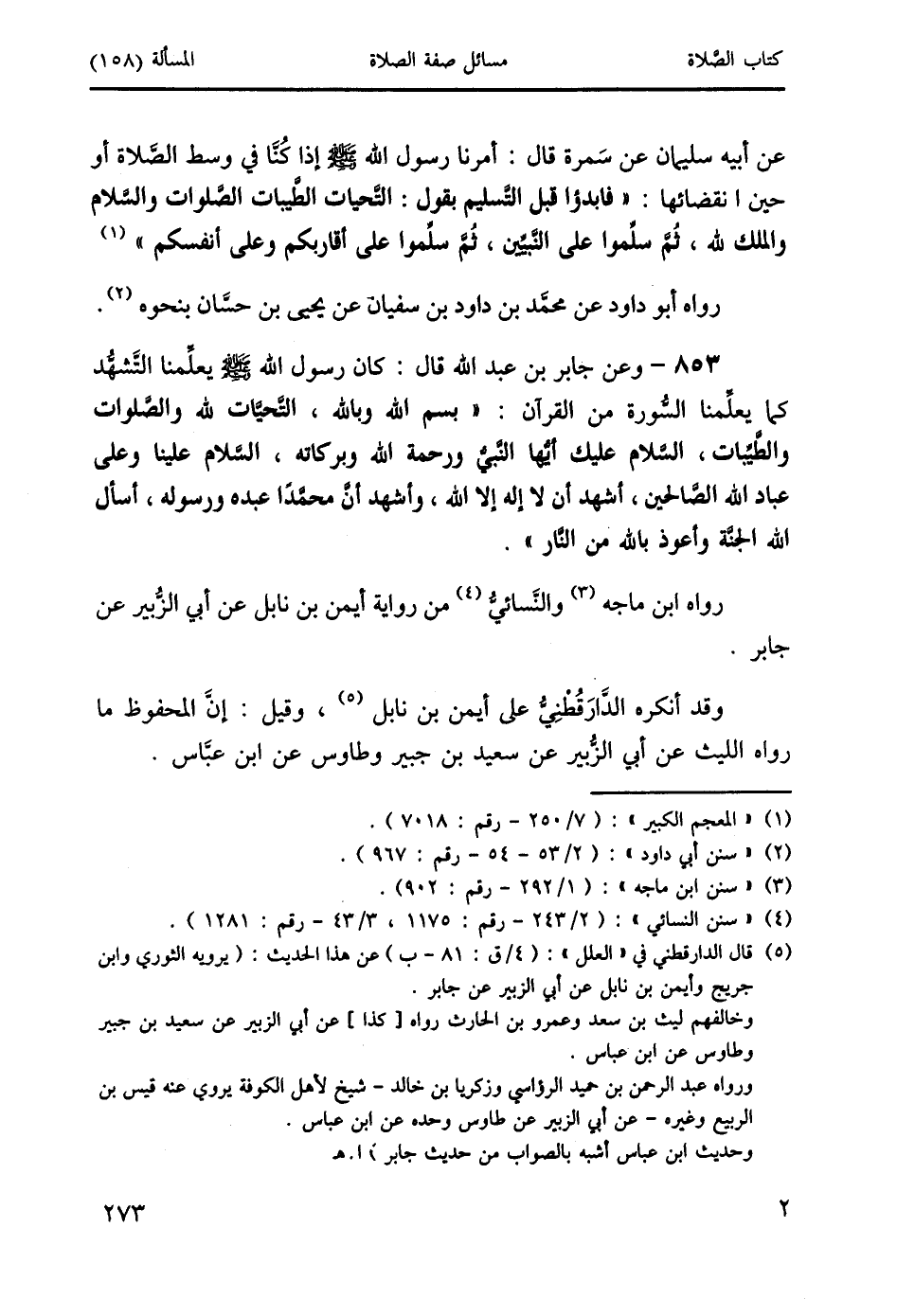 عن أبيه سليمان عن سمَرة قال: أمرنا رسول الله صَلَّى اللَّهُ عَلَيْهِ وَسَلَّمَ إذا كُنَّا في وسط الصَّلاة أو حين انقضائها: " فابدؤا قبل التَّسليم بقول: التَّحيات الطََّيبات الصَّلوات والسَّلام والملك لله، ثُمَّ سلموا على النَّبيَّين، ثُمَّ سلَّموا على أقاربكم وعلى أنفسكم " (1) رواه أبو داود عن محمد بن داود بن سفيان عن يحيى بن حسَّان بنحوه (2).