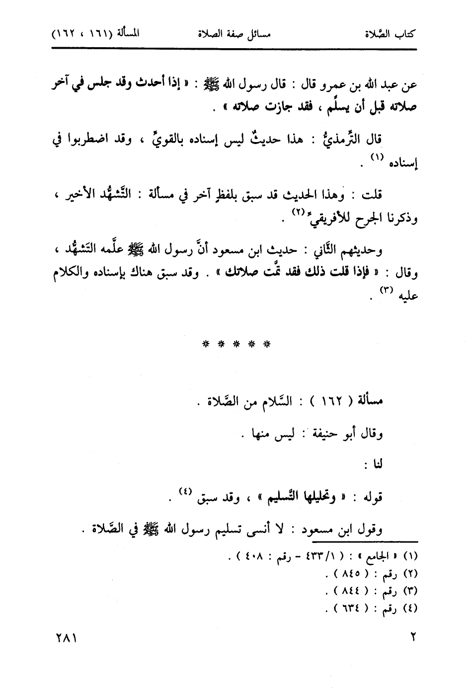 وحديثهم الثَّاني: حديث ابن مسعود أنَّ رسول الله صَلَّى اللَّهُ عَلَيْهِ وَسَلَّمَ علَّمه التَشهُّد، وقال: " فإذا قلت ذلك فقد تمَّت صلاتك ". وقد سبق هناك بإسناده والكلام عليه (3).