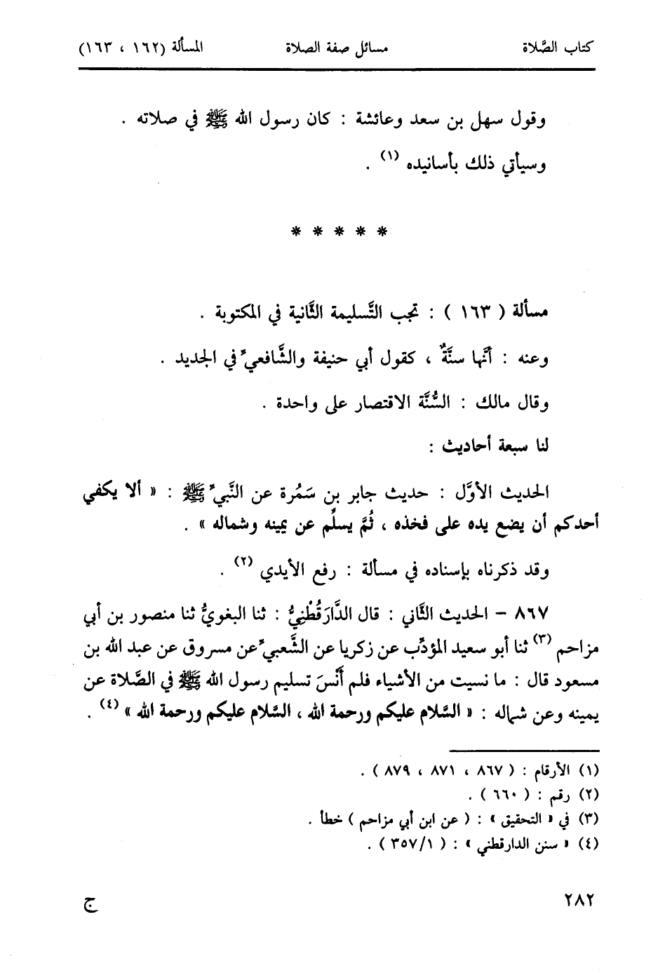 867 - الحديث الثَّاني: قال الدَّارَقُطْنِيُّ: ثنا البغويُّ ثنا منصور بن أبي مزاحم (3) ثنا أبو سعيد المؤدِّب عن زكريا عن الشَّعبيِّ عن مسروق عن عبد الله بن مسعود قال: ما نسيت من الأشياء فلم أَنْسَ تسليم رسول الله صَلَّى اللَّهُ عَلَيْهِ وَسَلَّمَ في الصَّلاة عن يمينه وعن شماله: " السَّلام عليكم ورحمة الله، السَّلام عليكم ورحمة الله " (4).