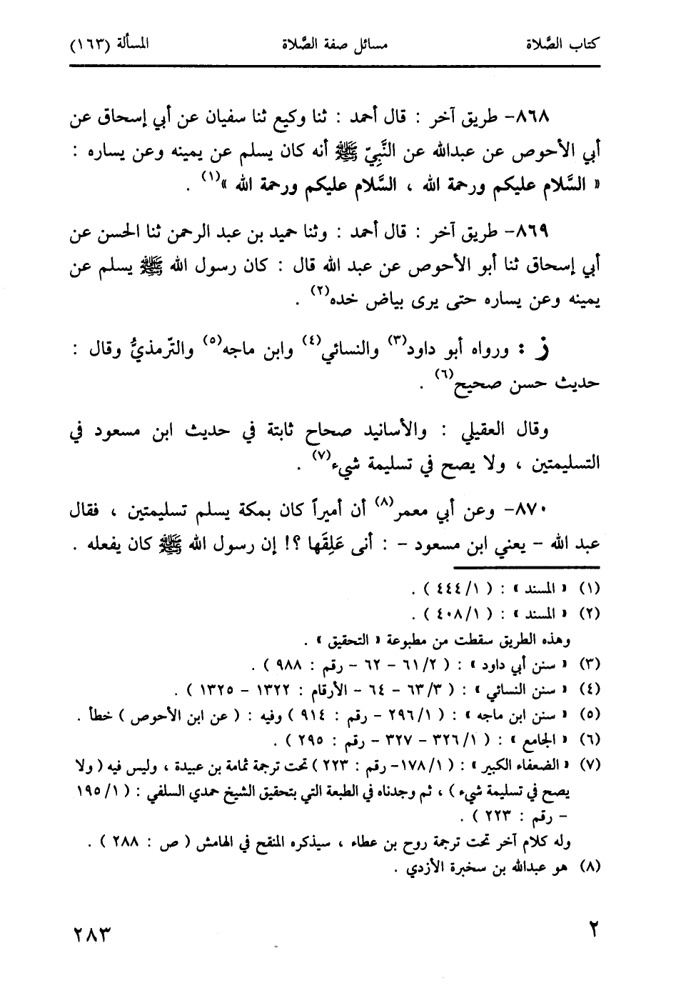 869 - طريق آخر: قال أحمد: وثنا حميد بن عبد الرَّحمن ثنا الحسن عن أبي إسحاق ثنا أبو الأحوص عن عبد الله قال: كان رسول الله صَلَّى اللَّهُ عَلَيْهِ وَسَلَّمَ يسلم عن يمينه وعن يساره حتى يرى بياض خده (2).