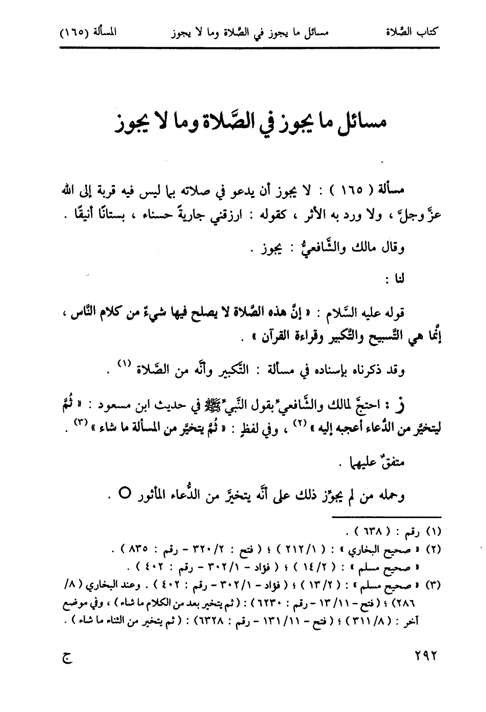 مسألة (165): لا يجوز أن يدعو في صلاته بما ليس فيه قربة إلى الله عزَّ وجلَّ، ولا ورد به الأثر، كقوله: ارزقني جاريةً حسناء، بستانًا أنيقًا.