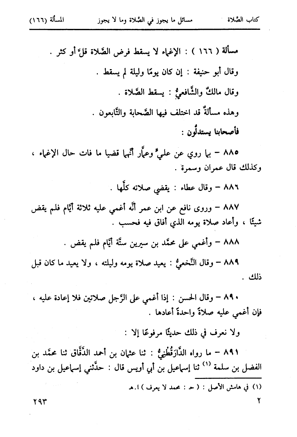 887 - وروى نافع عن ابن عمر أَنَّه أغمي عليه ثلاثة أيَّام فلم يقض شيئًا وأعاد صلاة يومه الذي أفاق فيه فحسب.
