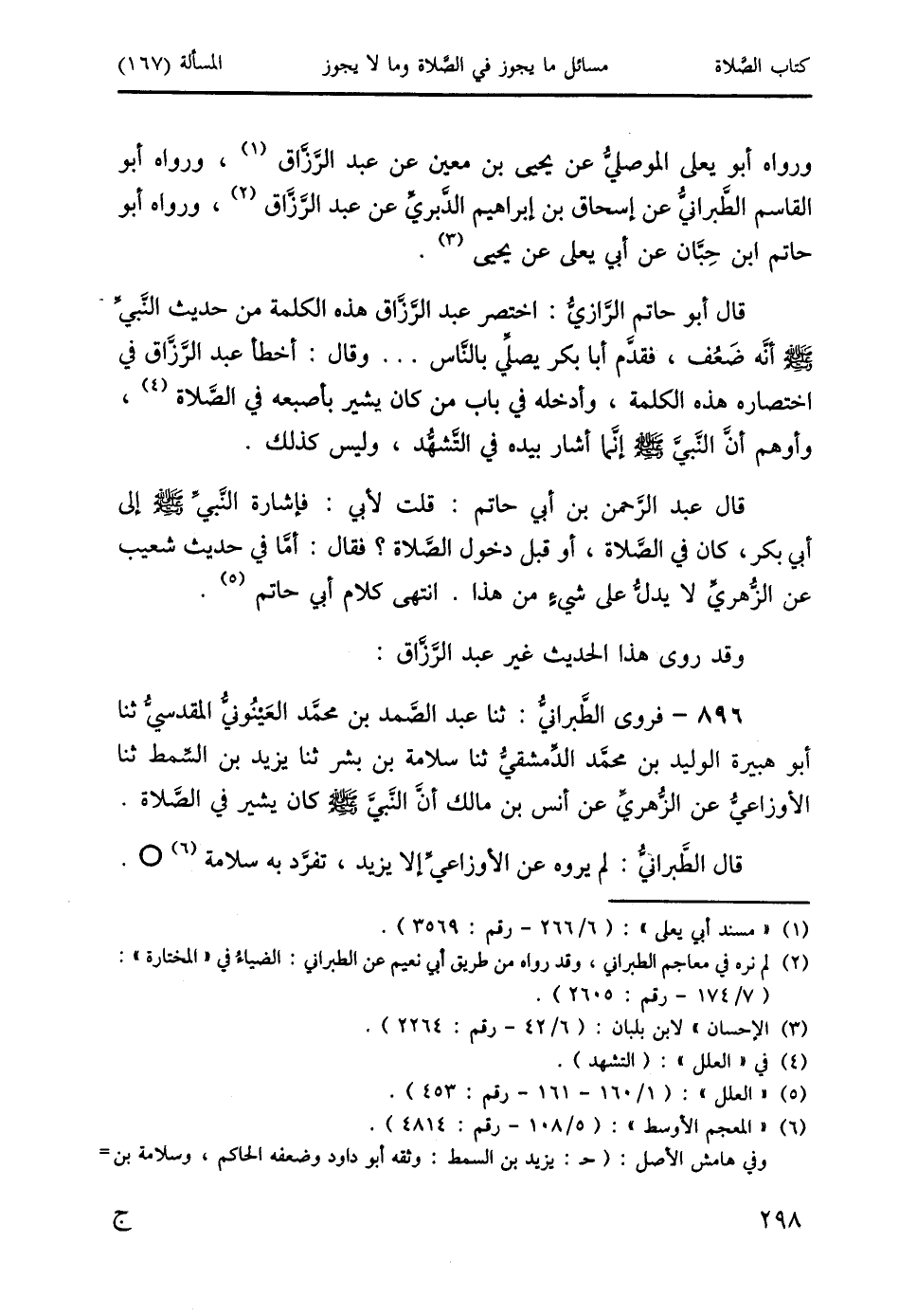 قال أبو حاتم الرَّازيُّ: اختصر عبد الرَّزَّاق هذه الكلمة من حديث النََّبيِّ صَلَّى اللَّهُ عَلَيْهِ وَسَلَّمَ أنَّه ضَعُف، فقدَّم أبا بكر يصلِّي بالناس ... وقال: أخطأ عبد الرَّزَّاق في اختصاره هذه الكلمة، وأدخله في باب من كان يشير بأصبعه في الصَّلاة (4)، وأوهم أنَّ النَّبيَّ صَلَّى اللَّهُ عَلَيْهِ وَسَلَّمَ إنَّما أشار بيده في التَّشهُّد، وليس كذلك.