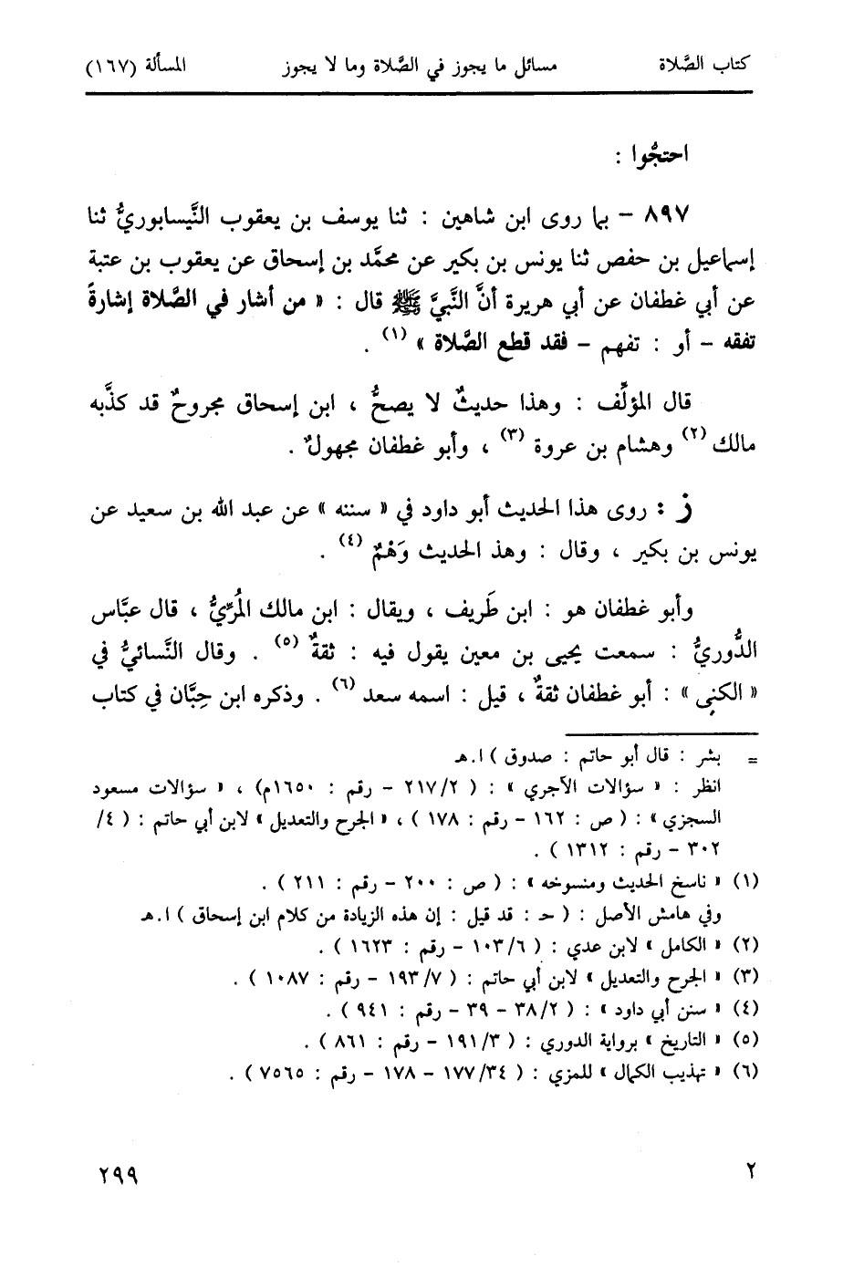 897 - بما روى ابن شاهين: ثنا يوسف بن يعقوب النَّيسابوريُّ ثنا إسماعيل بن حفص ثنا يونس بن بكير عن محمد بن إسحاق عن يعقوب بن عتبة عن أبي غطفان عن أبي هريرة أنَّ النَّبيَّ صَلَّى اللَّهُ عَلَيْهِ وَسَلَّمَ قال: " من أشار في الصَّلاة إشارةً تفقه - أو: تفهم - فقد قطع الصَّلاة " (1).
