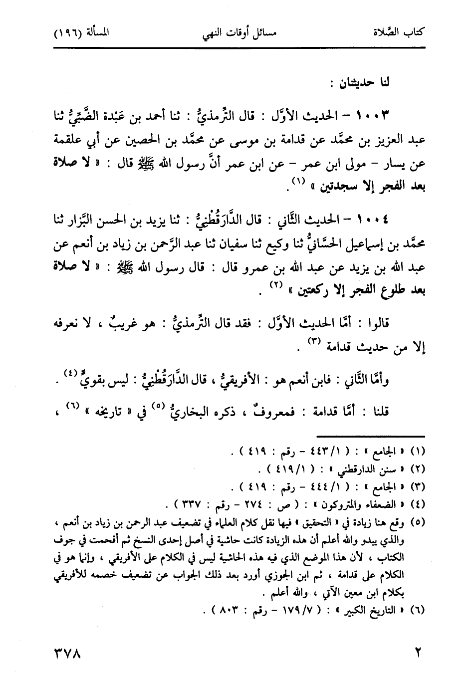 1003 - الحديث الأوَّل: قال التِّرمذيُّ: ثنا أحمد بن عَبْدة الضَّبِّيُّ ثنا عبد العزيز بن محمد عن قدامة بن موسى عن محمد بن الحصين عن أبي علقمة عن يسار - مولى ابن عمر - عن ابن عمر أنَّ رسول الله صَلَّى اللَّهُ عَلَيْهِ وَسَلَّمَ قال: " لا صلاة بعد الفجر إلا سجدتين " (1).