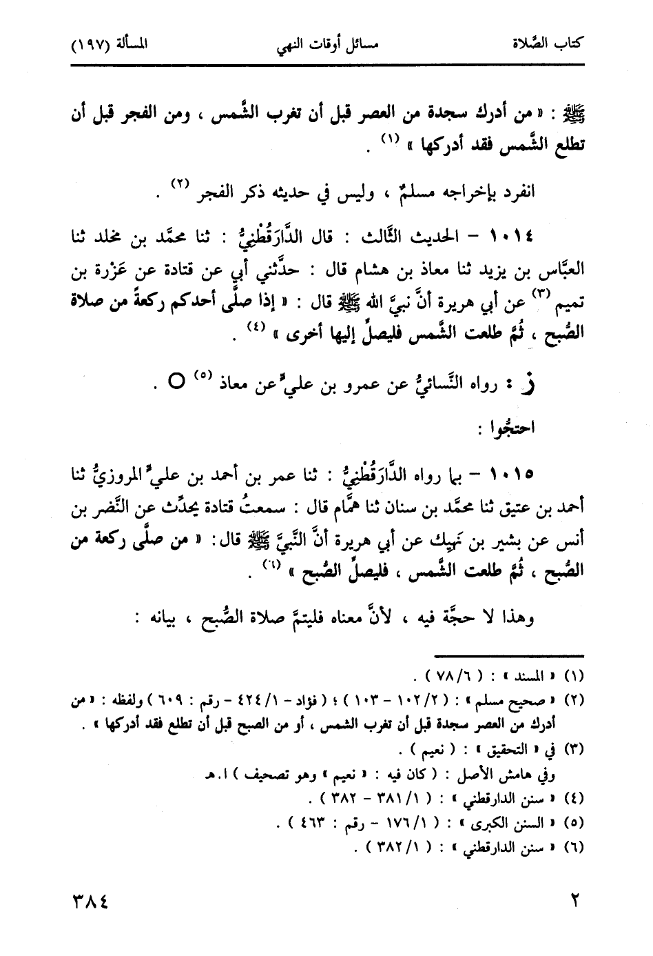 1015 - بما رواه الدَّارَقُطْنِيُّ: ثنا عمر بن أحمد بن عليٍّ المروزيُّ ثنا أحمد بن عتيق ثنا محمد بن سنان ثنا همَّام قال: سمعتُ قتادة يحدِّث عن النَّضر بن أنس عن بشير بن نَهِيك عن أبي هريرة أنَّ النَّبيَّ صَلَّى اللَّهُ عَلَيْهِ وَسَلَّمَ قال: " من صلَّى ركعة من الصُّبح، ثُمَّ طلعت الشَّمس، فليصلِّ الصُّبح " (6).