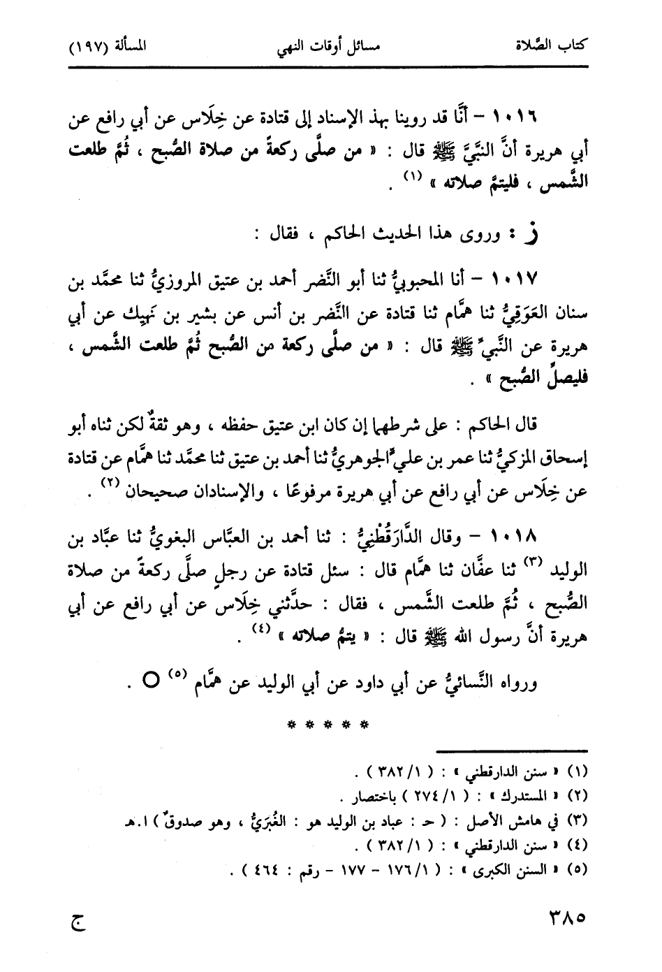 1016 - أنَّا قد روينا بهذا الإسناد إلى قتادة عن خِلاس عن أبي رافع عن أبي هريرة أنَّ النَّبيَّ صَلَّى اللَّهُ عَلَيْهِ وَسَلَّمَ قال: " من صلَّى ركعةً من صلاة الصُّبح، ثُمَّ طلعت الشَّمس، فليتمَّ صلاته " (1).