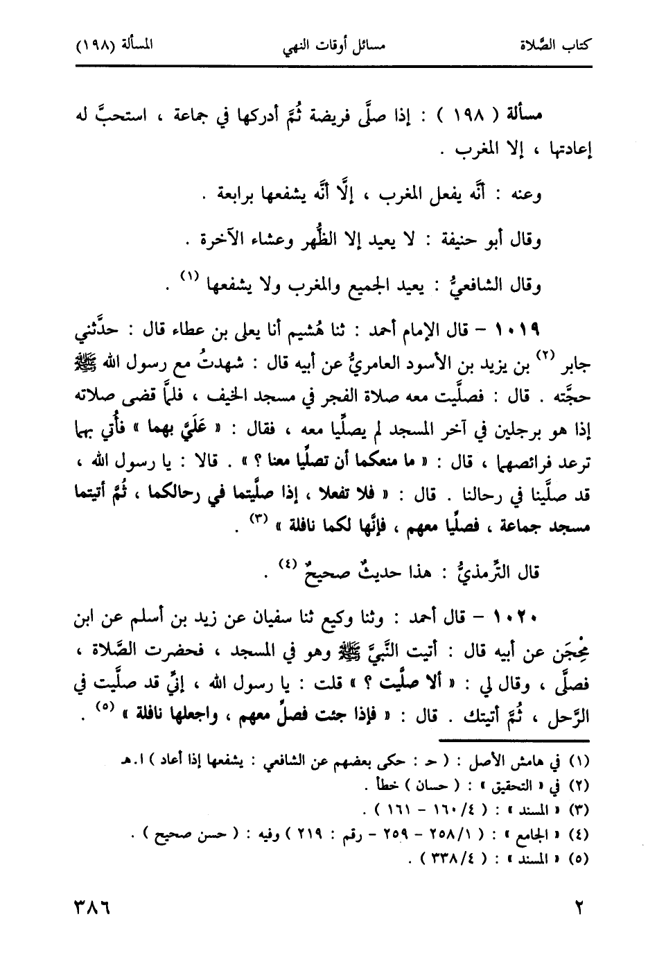 1019 - قال الإمام أحمد: ثنا هُشيم أنا يعلى بن عطاء قال: حدَّثني جابر (2) بن يزيد بن الأسود العامريُّ عن أبيه قال: شهدتُ مع رسول الله صَلَّى اللَّهُ عَلَيْهِ وَسَلَّمَ حجَّته. قال: فصلَّيت معه صلاة الفجر في مسجد الخيف، فلمَّا قضى صلاته إذا هو برجلين في آخر المسجد لم يصلِّيا معه، فقال: " عَلَيَّ بهما " فأُتي بهما ترعد فرائصهما، قال: " ما منعكما أن تصلِّيا معنا؟ ". قالا: يا رسول الله، قد صلِّينا في رحالنا. قال: " فلا تفعلا، إذا صلَّيتما في رحالكما، ثُمَّ أتيتما مسجد جماعة، فصلِّيا معهم، فإنَّها لكما نافلة " (3).