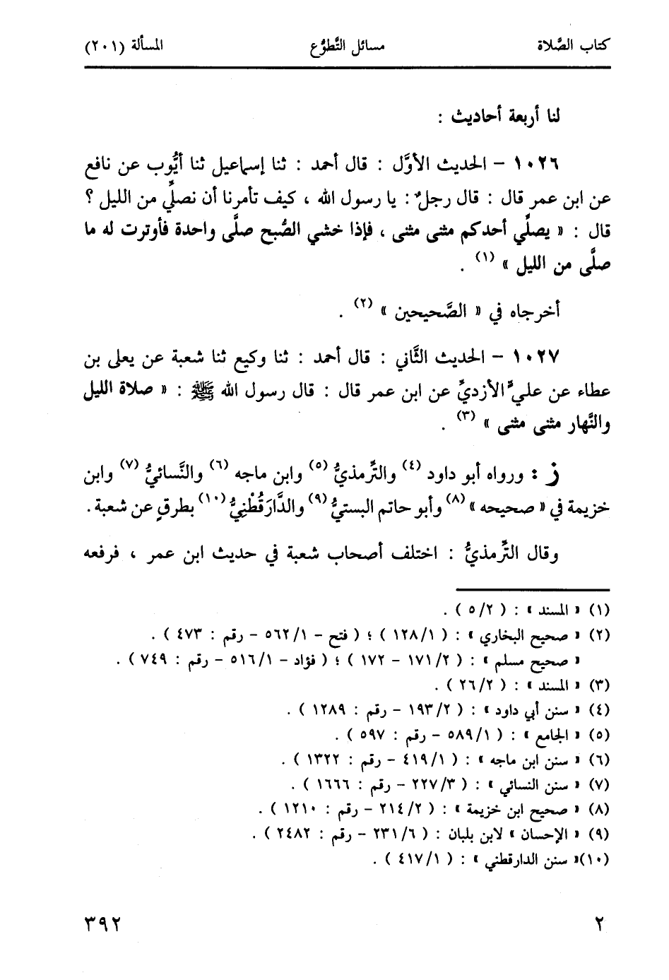 1026 - الحديث الأوَّل: قال أحمد: ثنا إسماعيل ثنا أيُّوب عن نافع عن ابن عمر قال: قال رجلٌ: يا رسول الله، كيف تأمرنا أن نصلِّي من الليل؟