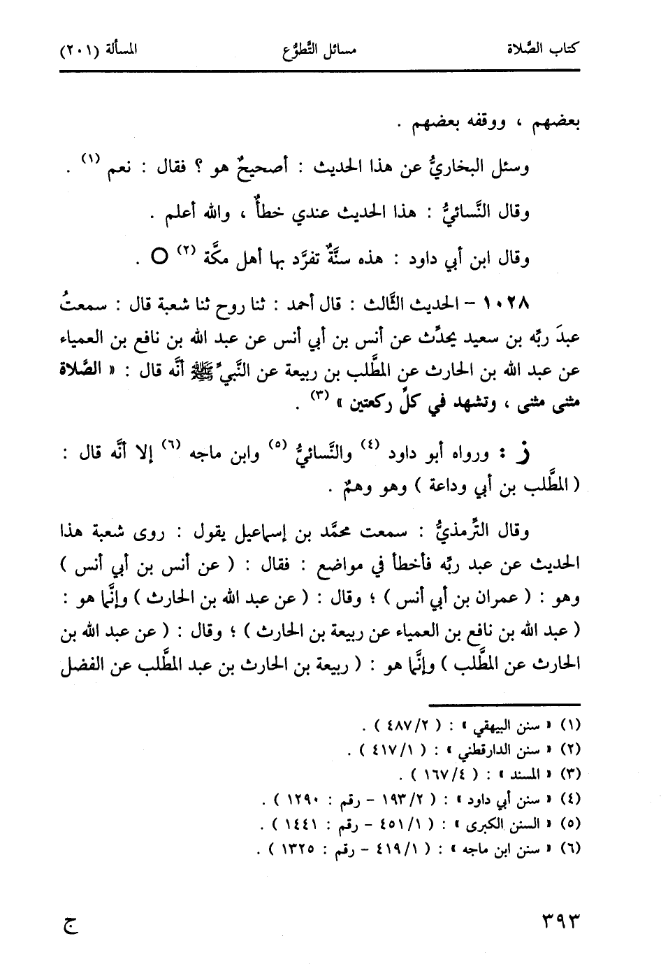 1028 - الحديث الثَّالث: قال أحمد: ثنا روح ثنا شعبة قال: سمعتُ عبدَ ربِّه بن سعيد يحدِّث عن أنس بن أبي أنس عن عبد الله بن نافع بن العمياء عن عبد الله بن الحارث عن المطَّلب بن ربيعة عن النَّبيِّ صَلَّى اللَّهُ عَلَيْهِ وَسَلَّمَ أَنَّه قال: " الصَّلاة مثنى مثنى، وتشهد في كلِّ ركعتين " (3).