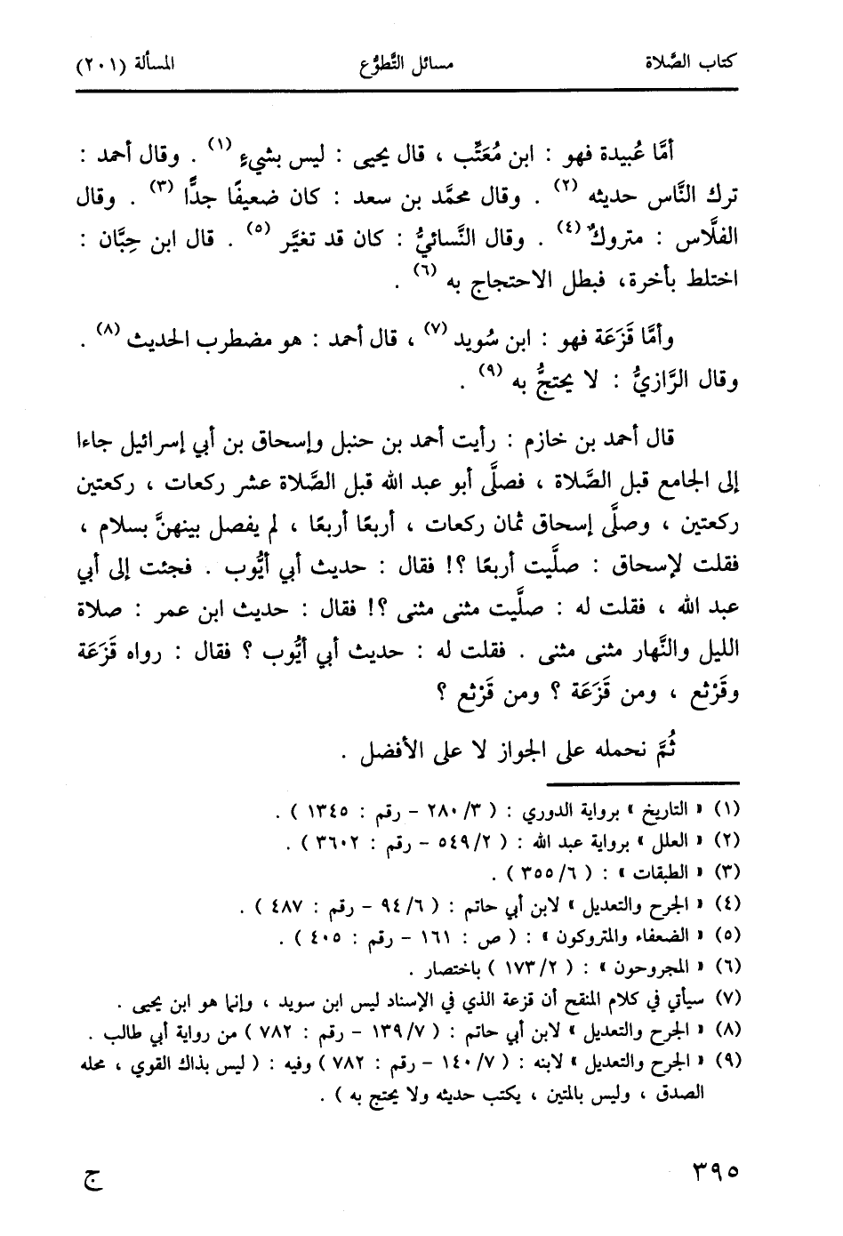 قال أحمد بن خازم: رأيت أحمد بن حنبل وإسحاق بن أبي إسرائيل جاءا إلى الجامع قبل الصَّلاة، فصلَّى أبو عبد الله قبل الصَّلاة عشر ركعات، ركعتين ركعتين، وصلَّى إسحاق ثمان ركعات، أربعًا أربعًا، لم يفصل بينهنَّ بسلام، فقلت لإسحاق: صلَّيت أربعًا؟! فقال: حديث أبي أيُّوب. فجئت إلى أبي عبد الله، فقلت له: صلَّيت مثنى مثنى؟! فقال: حديث ابن عمر: صلاة الليل والنَّهار مثنى مثنى. فقلت له: حديث أبي أيُّوب؟ فقال: رواه قَزَعَة وقَرْثع، ومن قَزَعَة؟ ومن قَرْثع؟