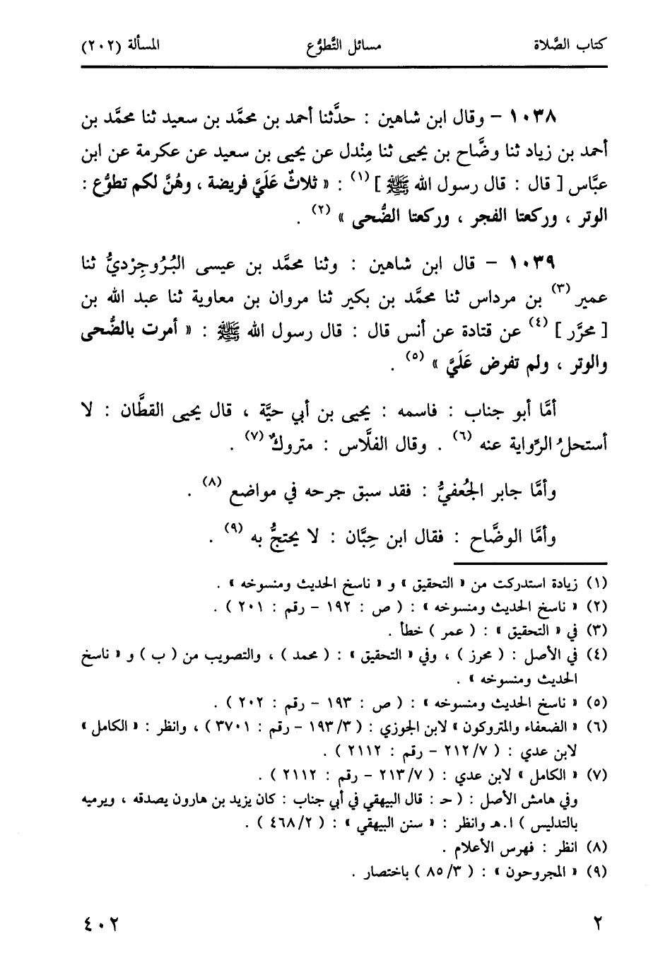 1039 - قال ابن شاهين: وثنا محمد بن عيسى البُرُوجِرْديُّ ثنا عمير (3) بن مرداس ثنا محمد بن بكير ثنا مروان بن معاوية ثنا عبد الله بن [محرَّر] (4) عن قتادة عن أنس قال: قال رسول الله صَلَّى اللَّهُ عَلَيْهِ وَسَلَّمَ: " أمرت بالضُّحى والوتر، ولم تفرض عَلَيَّ " (5).