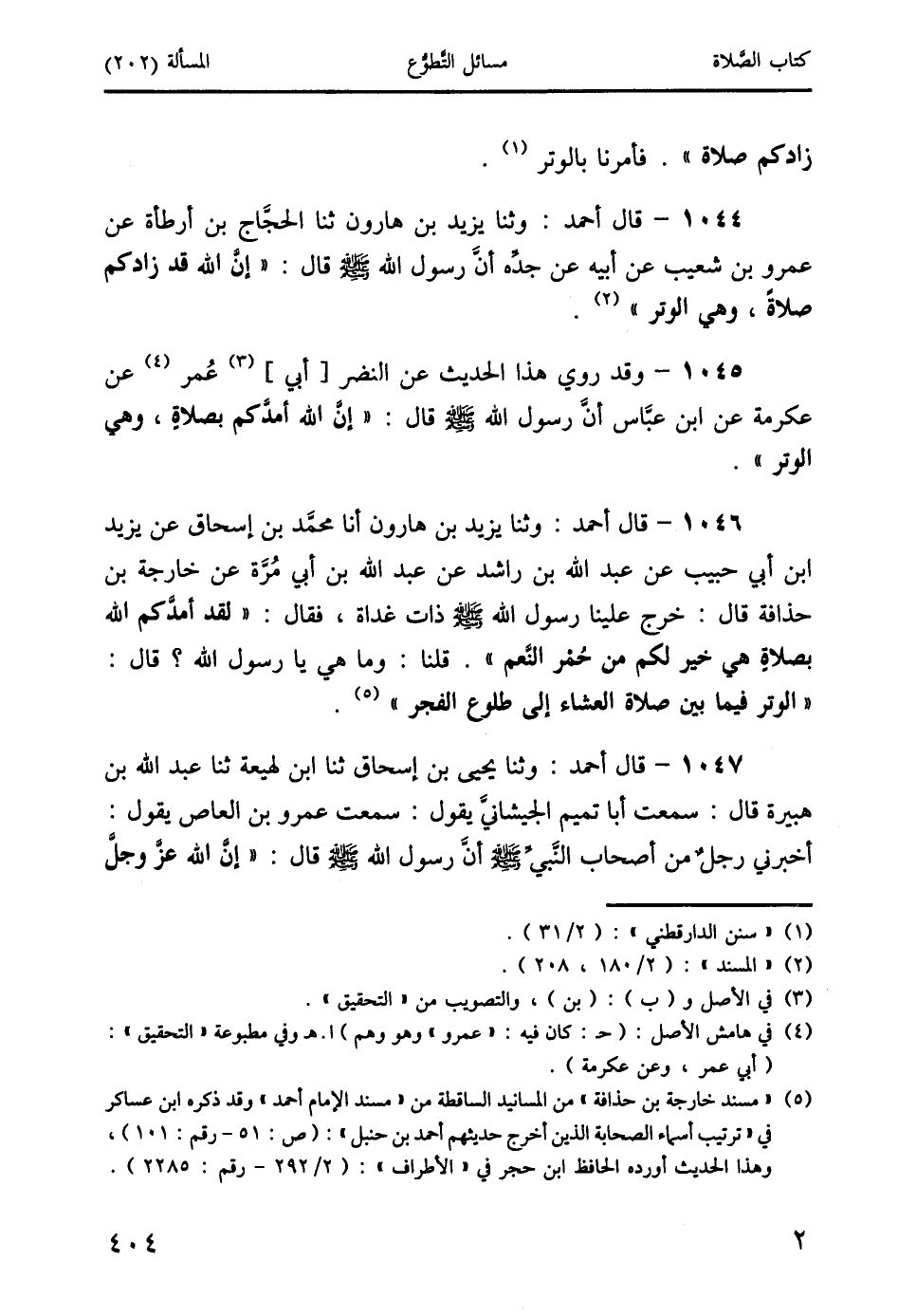 1046 - قال أحمد: وثنا يزيد بن هارون أنا محمد بن إسحاق عن يزيد ابن أبي حبيب عن عبد الله بن راشد عن عبد الله بن أبي مُرَّة عن خارجة بن حذافة قال: خرج علينا رسول الله صَلَّى اللَّهُ عَلَيْهِ وَسَلَّمَ ذات غداة، فقال: " لقد أمدَّكم الله بصلاةٍ هي خير لكم من حُمْر النَّعم ". قلنا: وما هي يا رسول الله؟ قال: " الوتر فيما بين صلاة العشاء إلى طلوع الفجر " (5).