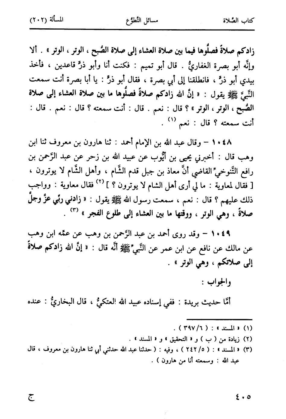 1048 - وقال عبد الله بن الإمام أحمد: ثنا هارون بن معروف ثنا ابن وهب قال: أخبرني يحيى بن أيُّوب عن عبيد الله بن زحر عن عبد الرَّحمن بن رافع التَّنوخيِّ القاضي أنَّ معاذ بن جبل قدم الشَّام، وأهل الشَّام لا يوترون، [فقال لمعاوية: ما لي أرى أهل الشَّام لا يوترون؟] (2) فقال معاوية: وواجب ذلك عليهم؟ قال: نعم، سمعت رسول الله صَلَّى اللَّهُ عَلَيْهِ وَسَلَّمَ يقول: " زادني ربِّي عزَّ وجلَّ صلاةً، وهي الوتر، ووقتها ما بين العشاء إلى طلوع الفجر " (3).