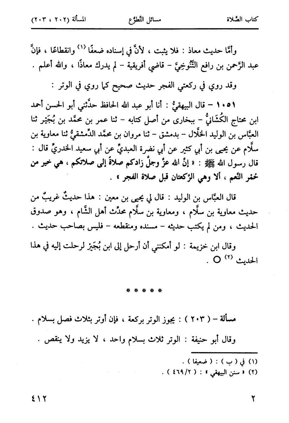 1051 - قال البيهقيُّ: أنا أبو عبد الله الحافظ حدَّثني أبو الحسن أحمد ابن محتاج الكُشَانيُّ - ببخارى من أصل كتابه - ثنا عمر بن محمد بن بُجَيْر ثنا العباس بن الوليد الخلاَّل - بدمشق - ثنا مروان بن محمد الدِّمشقيُّ ثنا معاوية بن سلاَّم عن يحيى بن أبي كثير عن أبي نضرة العبديِّ عن أبي سعيد الخدريِّ قال: قال رسول الله صَلَّى اللَّهُ عَلَيْهِ وَسَلَّمَ: " إنَّ الله عزَّ وجلَّ زادكم صلاةً إلى صلاتكم، هي خير من حُمْر النَّعم، إلا وهي الرَّكعتان قبل صلاة الفجر ".