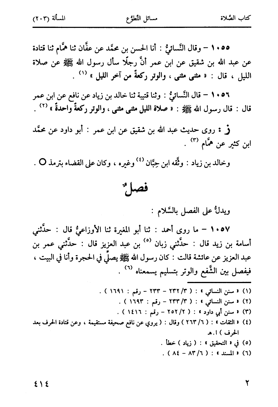1055 - وقال النَّسائيُّ: أنا الحسن بن محمد عن عفَّان ثنا همَّام ثنا قتادة عن عبد الله بن شقيق عن ابن عمر أنَّ رجلاً سأل رسول الله صَلَّى اللَّهُ عَلَيْهِ وَسَلَّمَ عن صلاة الليل، قال: " مثنى مثنى، والوتر ركعةٌ من آخر الليل " (1).