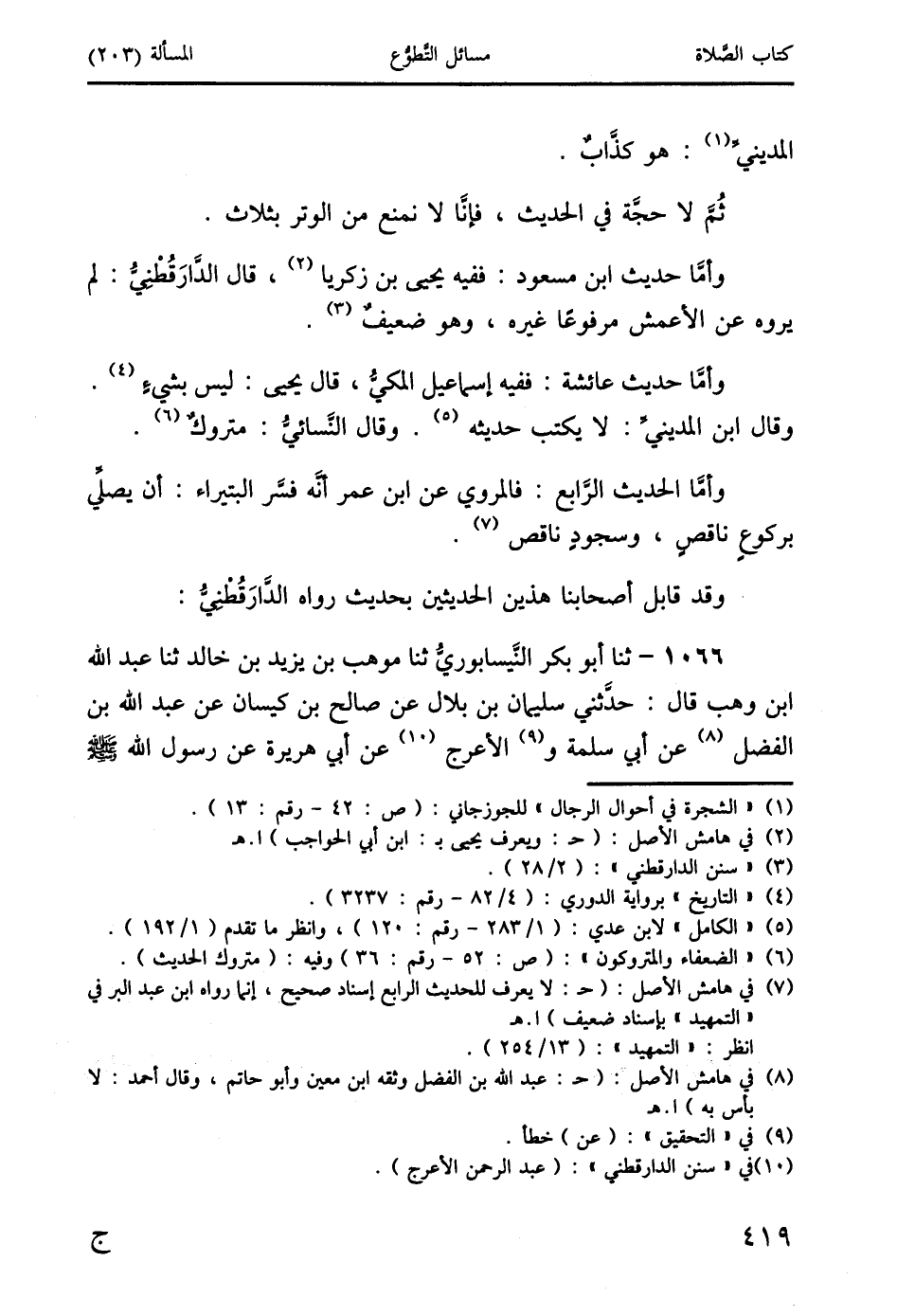 وأمَّا حديث ابن مسعود: ففيه يحيى بن زكريا (2)، قال الدَّارَقُطْنِيُّ: لم يروه عن الأعمش مرفوعًا غيره، وهو ضعيفٌ (3).
