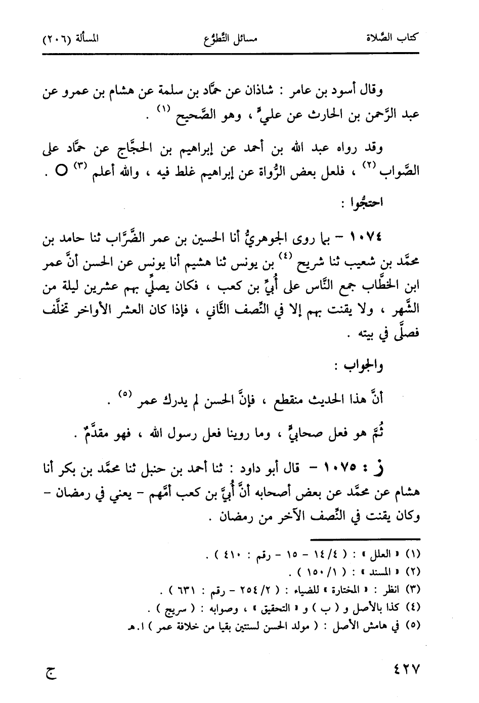 1074 - بما روى الجوهريُّ أنا الحسين بن عمر الضَّرَّاب ثنا حامد بن محمد بن شعيب ثنا شريح (4) بن يونس ثنا هشيم أنا يونس عن الحسن أنَّ عمر ابن الخطَّاب جمع النَّاس على أُبيِّ بن كعب، فكان يصلِّي بهم عشرين ليلة من الشَّهر، ولا يقنت بهم إلا في النِّصف الثَّاني، فإذا كان العشر الأواخر تخلَّف فصلَّى في بيته.