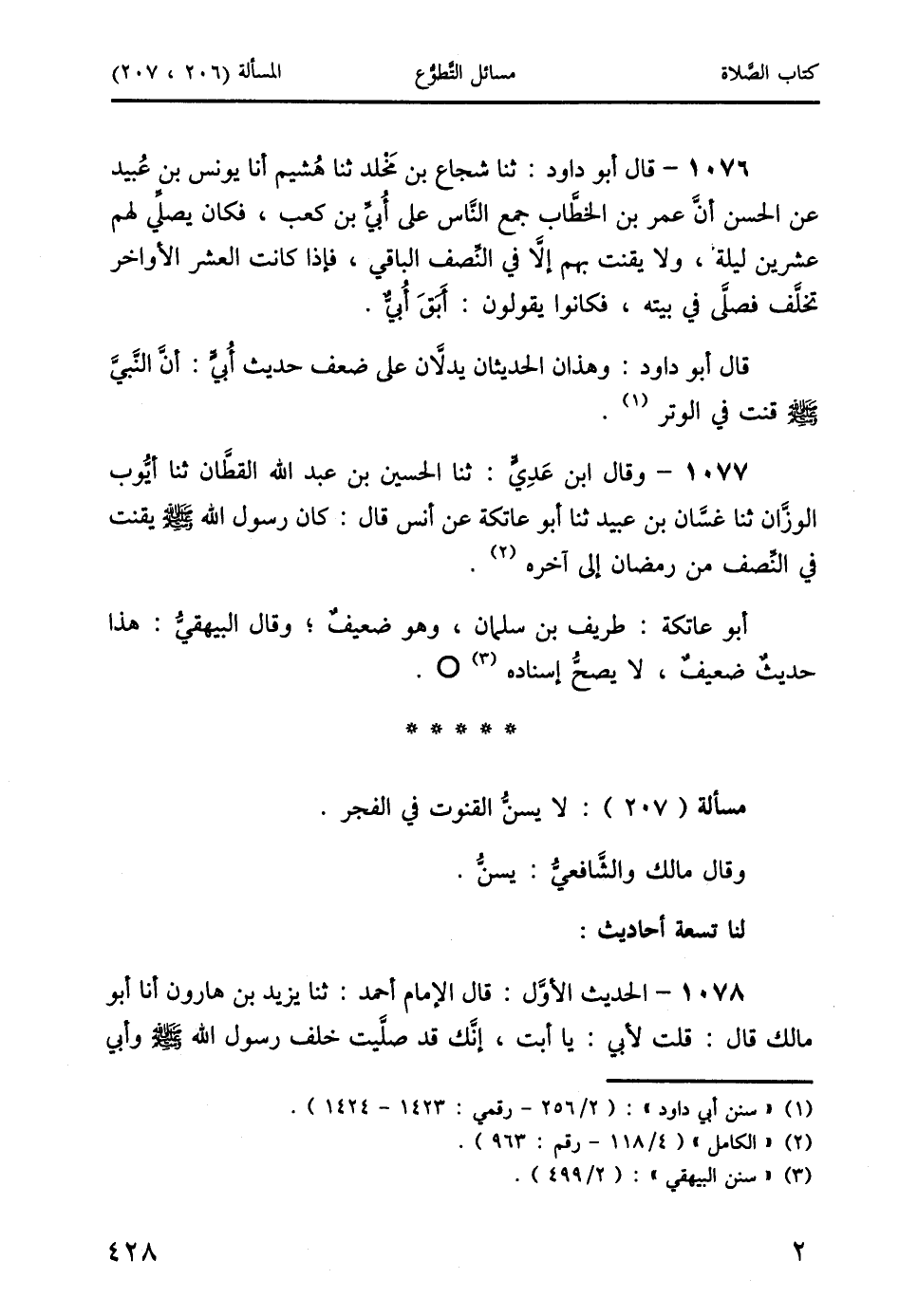قال أبو داود: وهذان الحديثان يدلان على ضعف حديث أُبيٍّ: أنَّ النَّبيَّ صَلَّى اللَّهُ عَلَيْهِ وَسَلَّمَ قنت في الوتر (1).