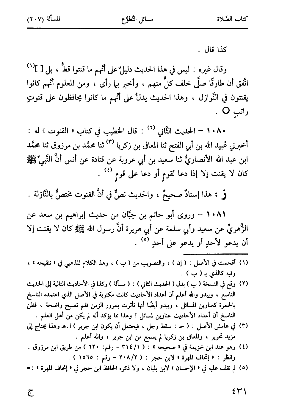 1081 - وروى أبو حاتم بن حِبَّان من حديث إبراهيم بن سعد عن الزُّهريِّ عن سعيد وأبي سلمة عن أبي هريرة أنَّ رسول الله صَلَّى اللَّهُ عَلَيْهِ وَسَلَّمَ كان لا يقنت إلا أن يدعو لأحدٍ أو يدعو على أحدٍ (5).