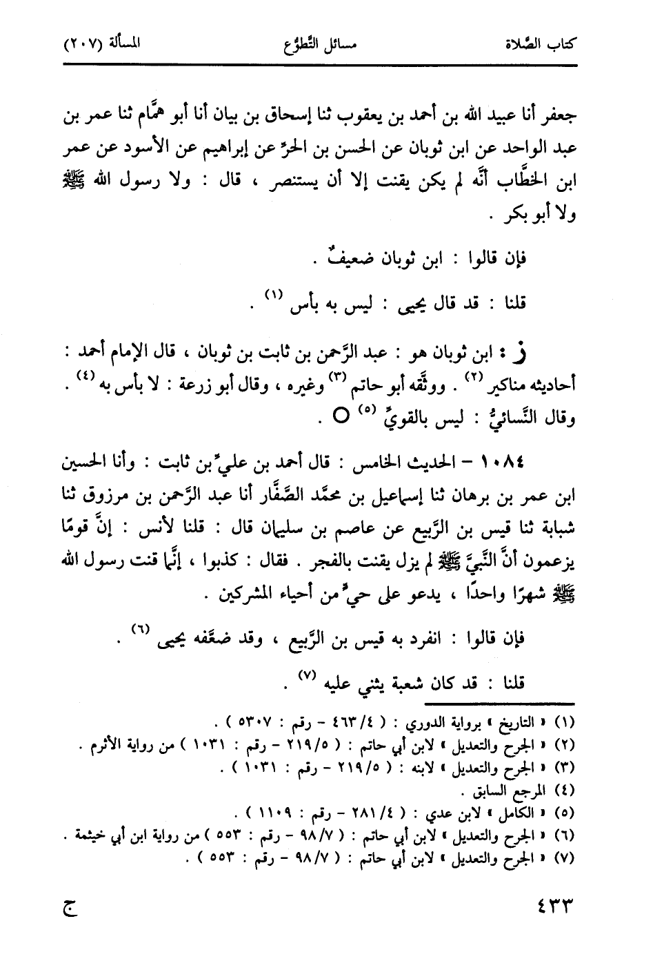 جعفر أنا عبيد الله بن أحمد بن يعقوب ثنا إسحاق بن بيان أنا أبو همَّام ثنا عمر بن عبد الواحد عن ابن ثوبان عن الحسن بن الحرِّ عن إبراهيم عن الأسود عن عمر ابن الخطَّاب أنَّه لم يكن يقنت إلا أن يستنصر، قال: ولا رسول الله صَلَّى اللَّهُ عَلَيْهِ وَسَلَّمَ ولا أبو بكر.