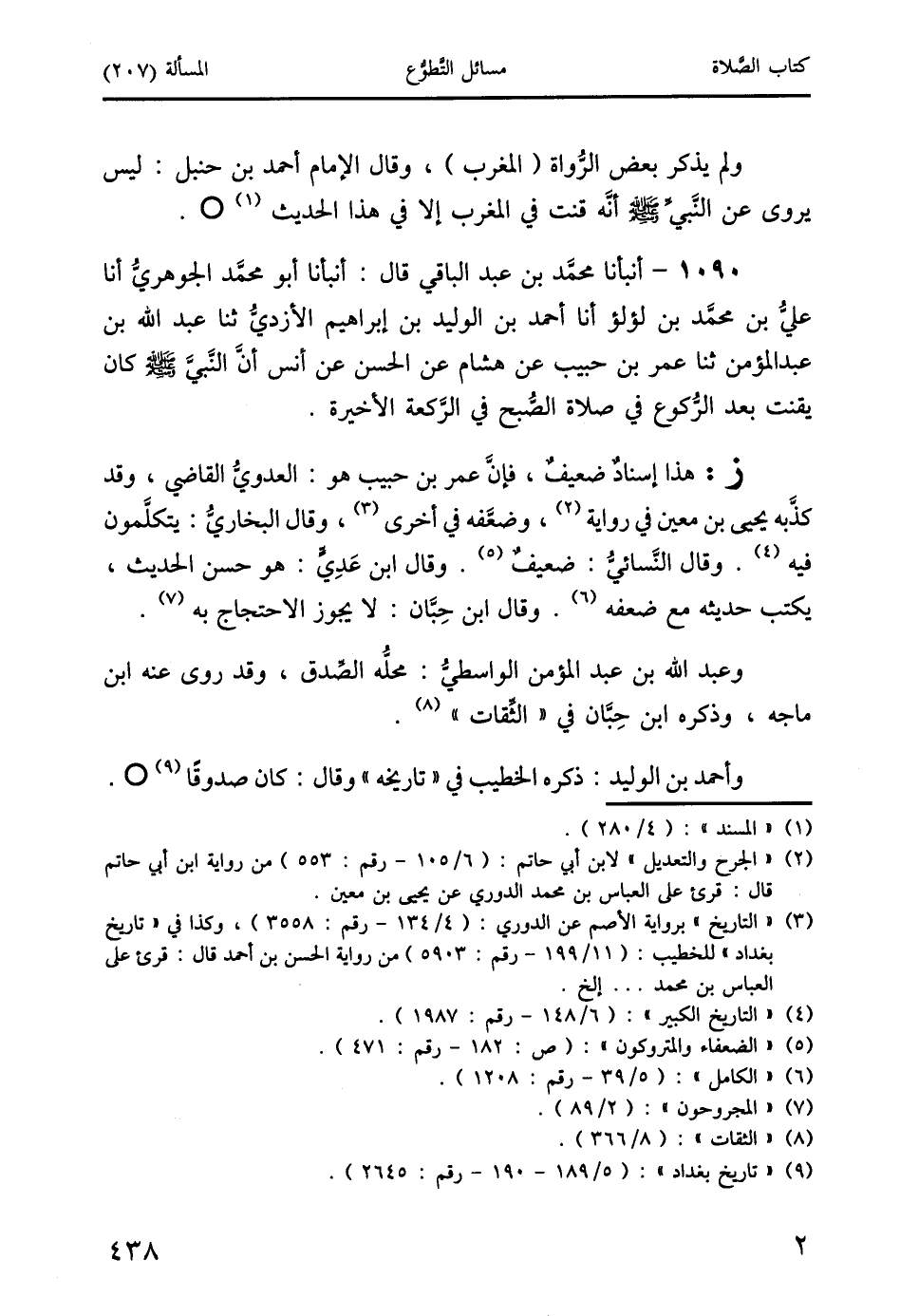 1090 - أنبأنا محمد بن عبد الباقي قال: أنبأنا أبو محمد الجوهريُّ أنا عليُّ بن محمد بن لؤلؤ أنا أحمد بن الوليد بن إبراهيم الأزديُّ ثنا عبد الله بن عبد المؤمن ثنا عمر بن حبيب عن هشام عن الحسن عن أنس أنَّ النَّبيَّ صَلَّى اللَّهُ عَلَيْهِ وَسَلَّمَ كان يقنت بعد الرُّكوع في صلاة الصُّبح في الرَّكعة الأخيرة.