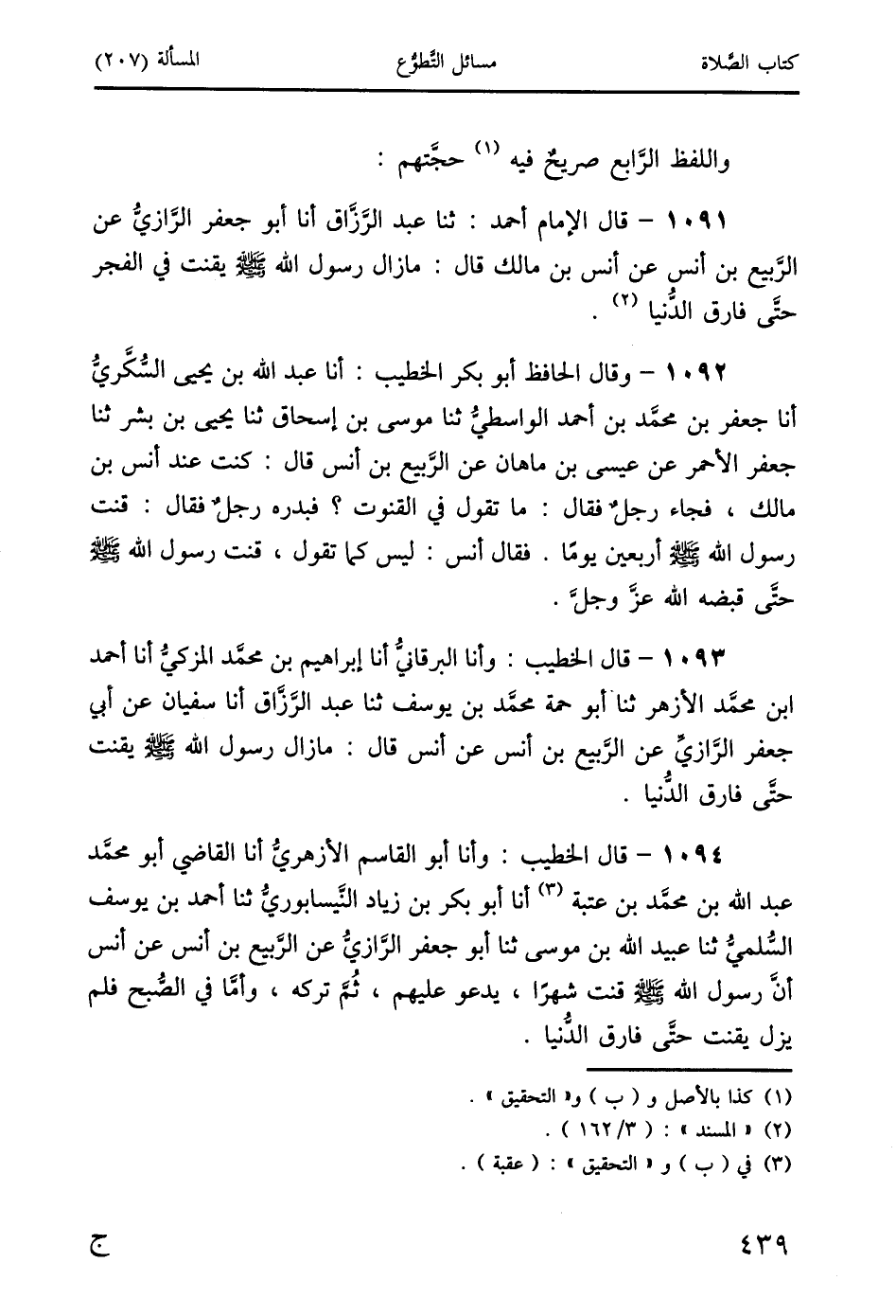 1091 - قال الإمام أحمد: ثنا عبد الرَّزَّاق أنا أبو جعفر الرَّازيُّ عن الرَّبيع بن أنس عن أنس بن مالك قال: مازال رسول الله صَلَّى اللَّهُ عَلَيْهِ وَسَلَّمَ يقنت في الفجر حتى فارق الدُّنيا (2).