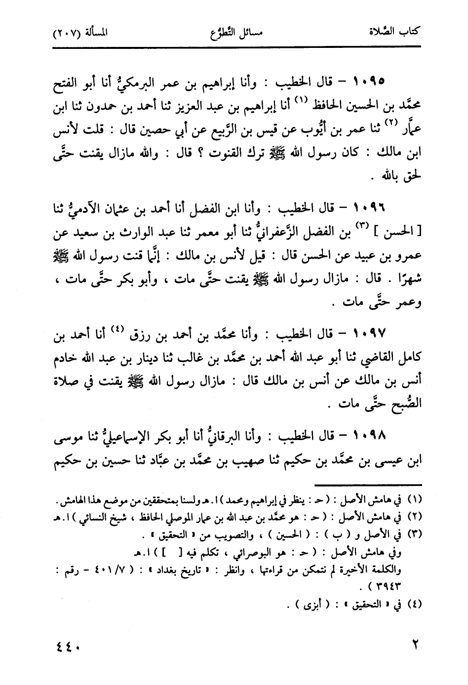 1096 - قال الخطيب: وأنا ابن الفضل أنا أحمد بن عثمان الآدميُّ ثنا [الحسن] (3) بن الفضل الزَّعفرانيُّ ثنا أبو معمر ثنا عبد الوارث بن سعيد عن عمرو بن عبيد عن الحسن قال: قيل لأنس بن مالك: إنَّما قنت رسول الله صَلَّى اللَّهُ عَلَيْهِ وَسَلَّمَ شهرًا. قال: مازال رسول الله صَلَّى اللَّهُ عَلَيْهِ وَسَلَّمَ يقنت حتى مات، وأبو بكر حتى مات، وعمر حتى مات.