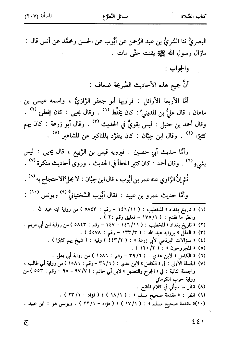 البصريُّ ثنا السَّريُّ بن عبد الرَّحمن عن أيُّوب عن الحسن ومحمد عن أنس قال: ما زال رسول الله صَلَّى اللَّهُ عَلَيْهِ وَسَلَّمَ يقنت حتى مات.