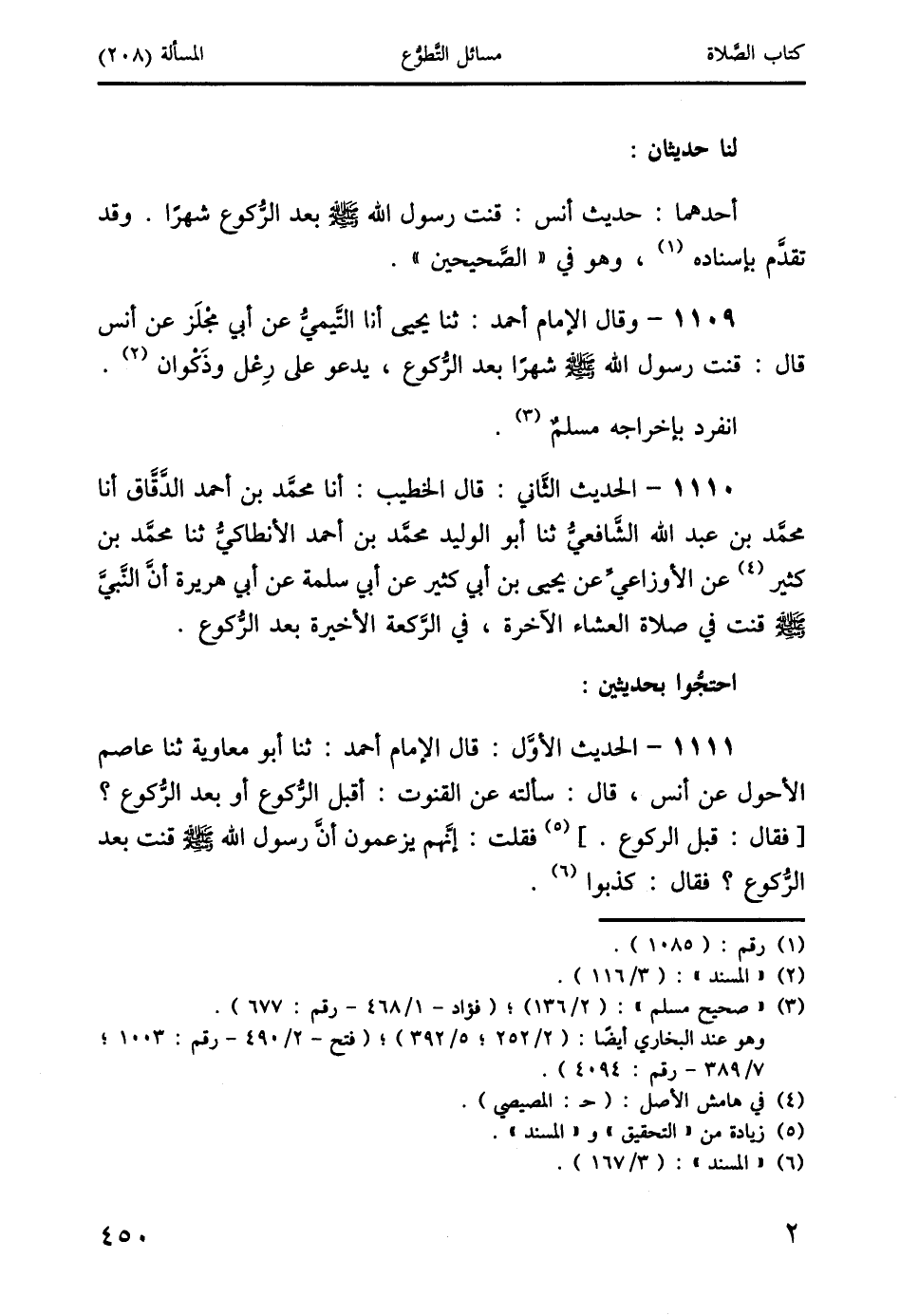 1111 - الحديث الأوَّل: قال الإمام أحمد: ثنا أبو معاوية ثنا عاصم الأحول عن أنس، قال: سألته عن القنوت: أقبل الرُّكوع أو بعد الرُّكوع؟