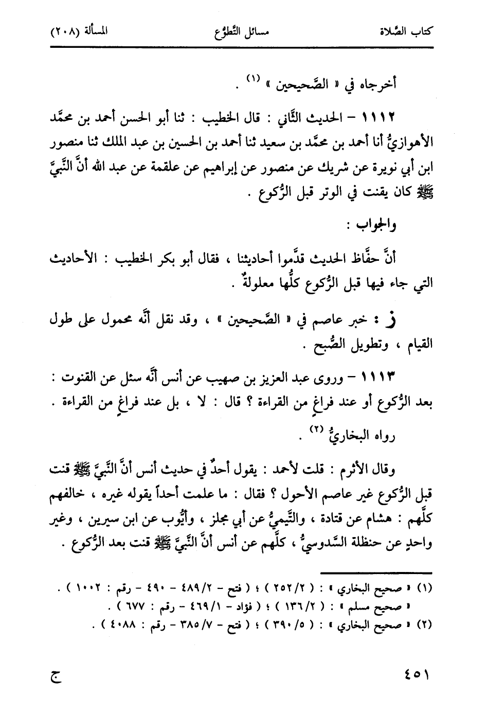 1113 - وروى عبد العزيز بن صهيب عن أنس أنَّه سئل عن القنوت: بعد الرُّكوع أو عند فراغٍ من القراءة؟ قال: لا، بل عند فراغٍ من القراءة.