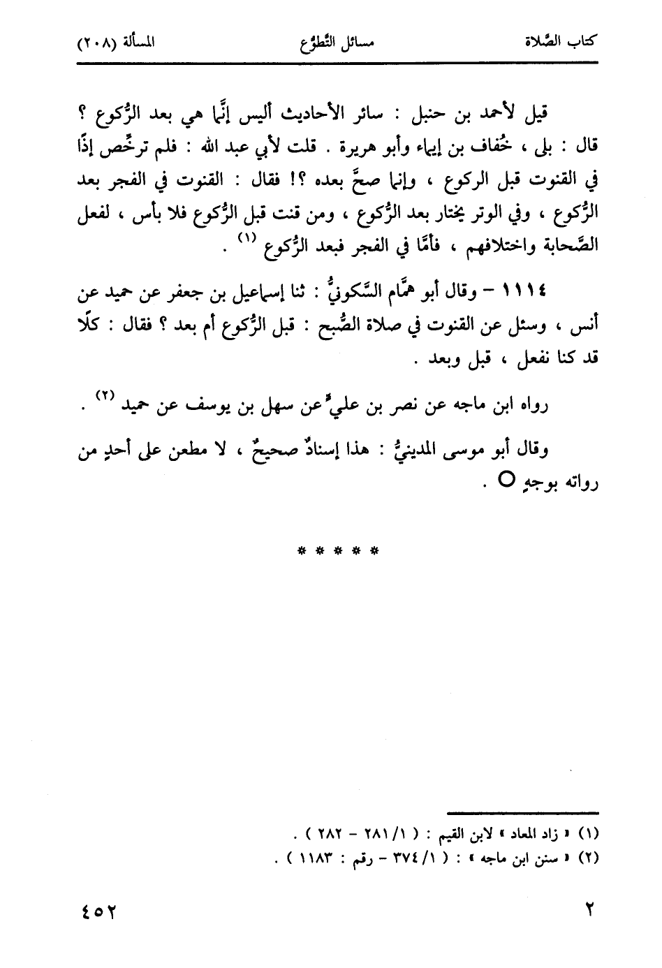 1114 - وقال أبو همَّام السَّكونيُّ: ثنا إسماعيل بن جعفر عن حميد عن أنس، وسئل عن القنوت في صلاة الصُّبح: قبل الرُّكوع أم بعد؟ فقال: كلاً قد كنا نفعل، قبل وبعد.