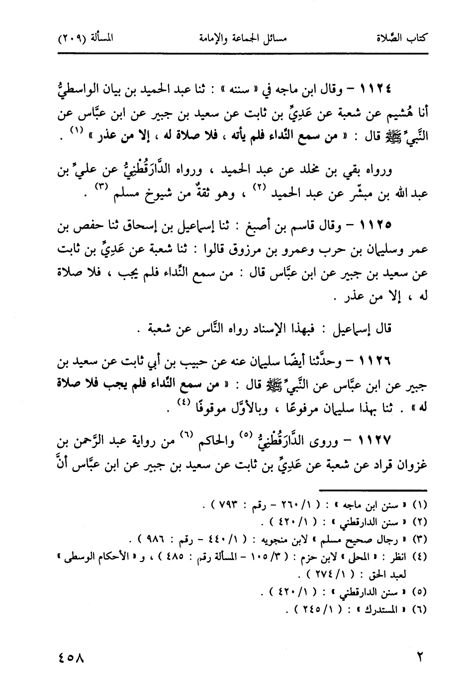 1124 - وقال ابن ماجه في "سننه": ثنا عبد الحميد بن بيان الواسطيُّ أنا هُشيم عن شعبة عن عَدِيٍّ بن ثابت عن سعيد بن جبير عن ابن عباس عن النَّبيِّ صَلَّى اللَّهُ عَلَيْهِ وَسَلَّمَ قال: " من سمع النِّداء فلم يأته، فلا صلاة له، إلا من عذر " (1).