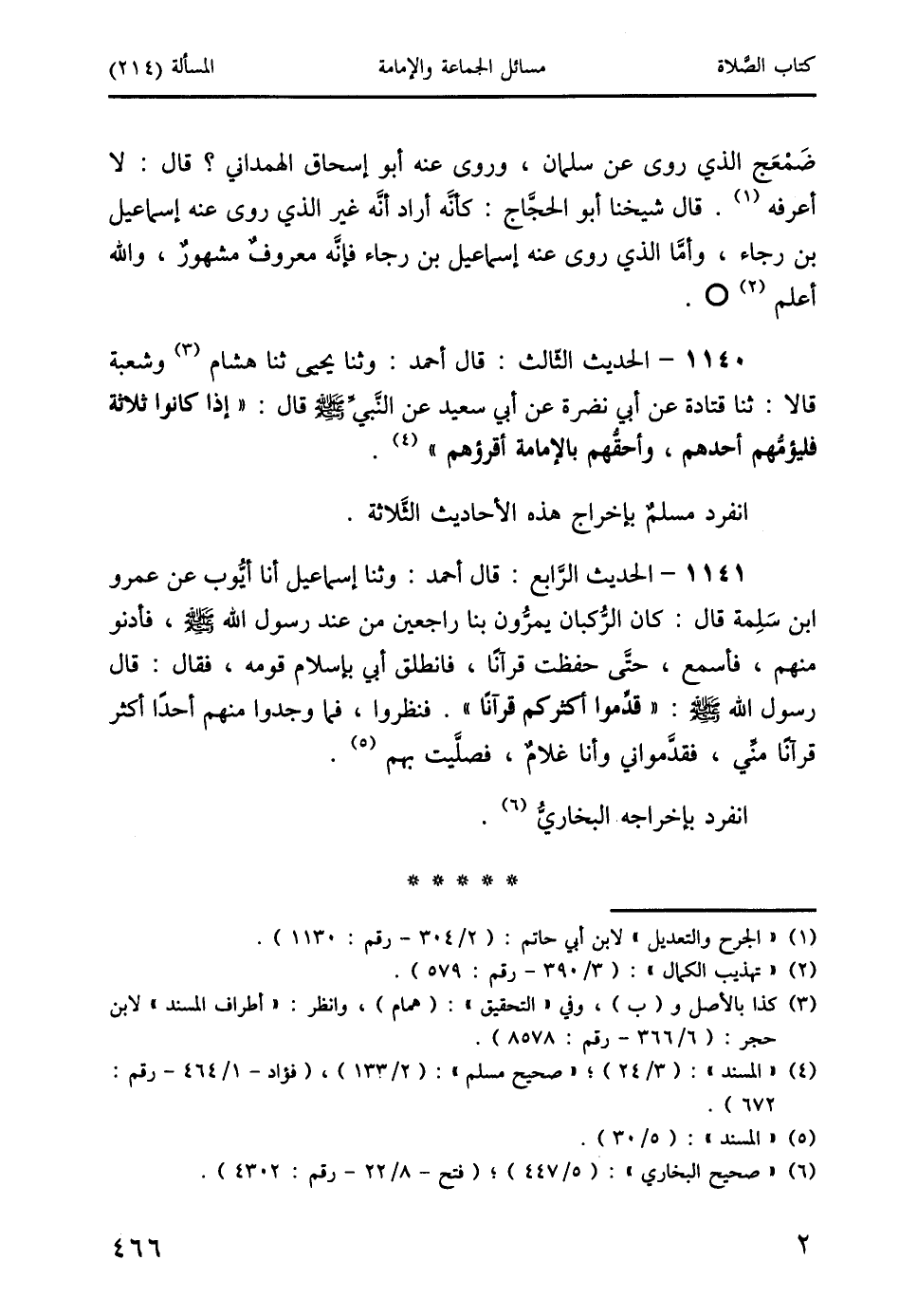 1140 - الحديث الثَّالث: قال أحمد: وثنا يحيى ثنا هشام (3) وشعبة قالا: ثنا قتادة عن أبي نضرة عن أبي سعيد عن النَّبيِّ صَلَّى اللَّهُ عَلَيْهِ وَسَلَّمَ قال: " إذا كانوا ثلاثة فليؤمُّهم أحدهم، وأحقُّهم بالإمامة أقرؤهم " (4).